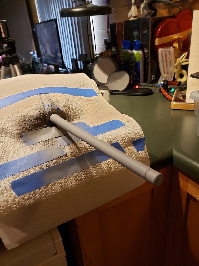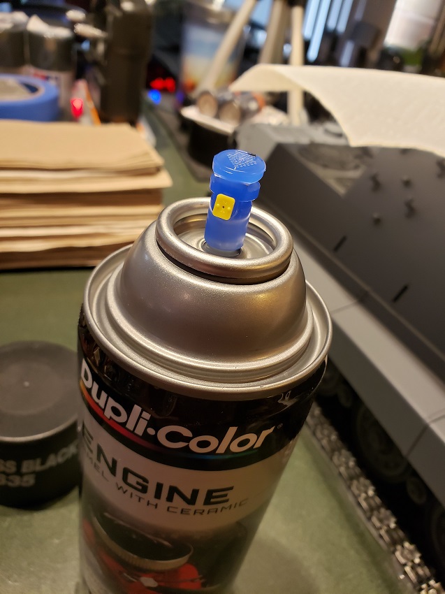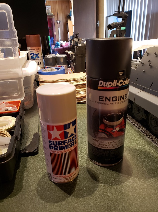 A hazy and quiet Saturday afternoon gave me an hour plus to do the black barrel on the Jagdtiger. With some cool black paint with a ceramic additive I found at the local Automotive store, I was ready to go. It took longer to tape together the overspray shroud than to do the actual spray. A wipe with a lint cloth and a light coat of Tamiya grey primer made for a nice and smooth surface to followup with the black ceramic paint. Once everything is cured, I can do any brushup and cleanup needed.