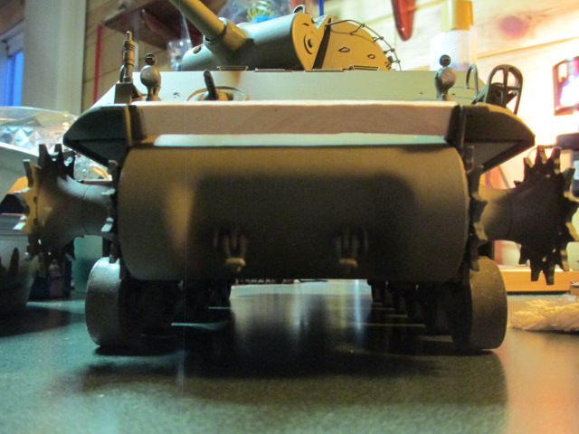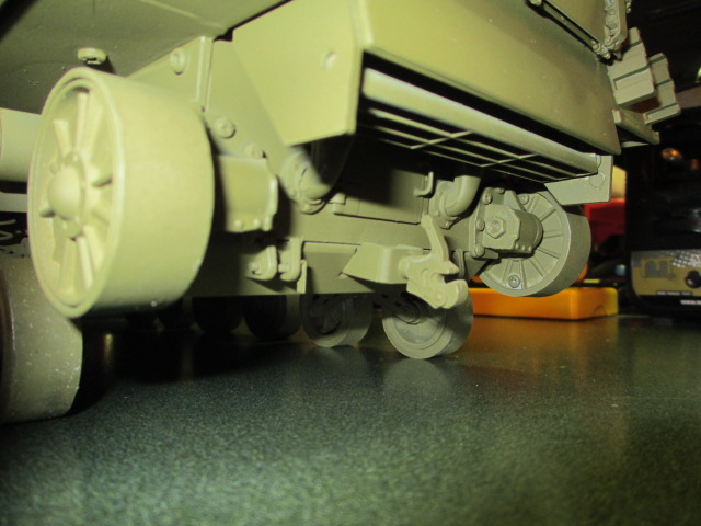 Good evening all, Spent a little more time on the M36B1 today and began the work around the turret. I added the little pads you see in photos and painted the back one that MATO had already cast in place and cleaned up the paint around the turret edges. I installed the sprockets and checked for run out ( much easier to see if the tracks are off of the vehicle ) MATO did a fair job, there was only a little waver and that vanished at full throttle. ( well, it didn't but it's a lot harder to see ;o) I installed the idlers as well and bumped them forward a notch to take away some of the track tightness. I am sure I will have to play around with those adjustable idlers to get it right. I have been using needle nose pliers to get their nuts tightened down but I think that MATOs metal adjuster wrench might actually fit. Some fun for tomorrow. ( I have a spare in case it is crumbly )