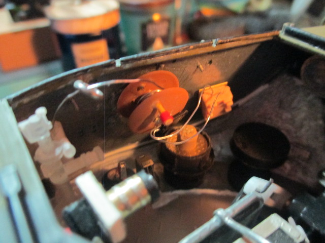 Busy day today with nothing in the mail. I sat down tonight to do a little more work on the turret. Got the Binocs case and the last canteen mounted. Then on to a stickier problem. To this date, I had ordered three supposedly 1/18 fire extinguishers for this build. The Singapore based one turned out to be one of those 'sell two million cheap parts ( 3 or 4 dollars apiece ) ship none and return the possible 100,000 complainers money and pocket the rest' scams. I got my 4 bucks back and turned to buying the next two from the States. Both of those were way out of scale. 1/10 and 1/6 respectively. I kept the 1/6 one for the Stuart build and after prodding from a Superior, set about to build my own. Using a couple of pieces from the 1/10 extinguisher ( including the nice mount ) some tubing and some left over brass, it turned out OK. It will look better once painted but is at least the right scale. Pics: