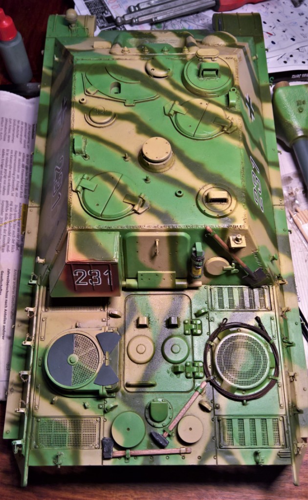 Now it will be gloss coating stenceling the crosses on the backside boxes and do the Brown wash. Already washed the outside road wheels, the inside wheels will be next.
