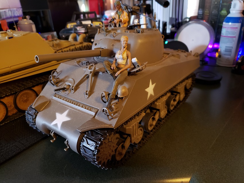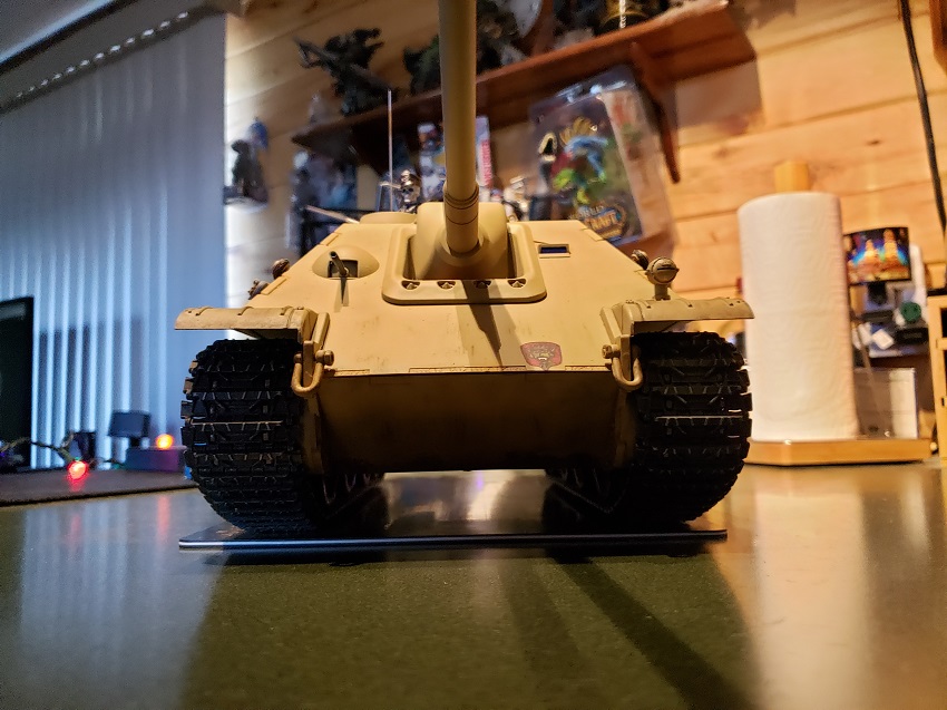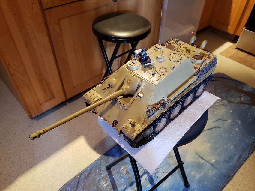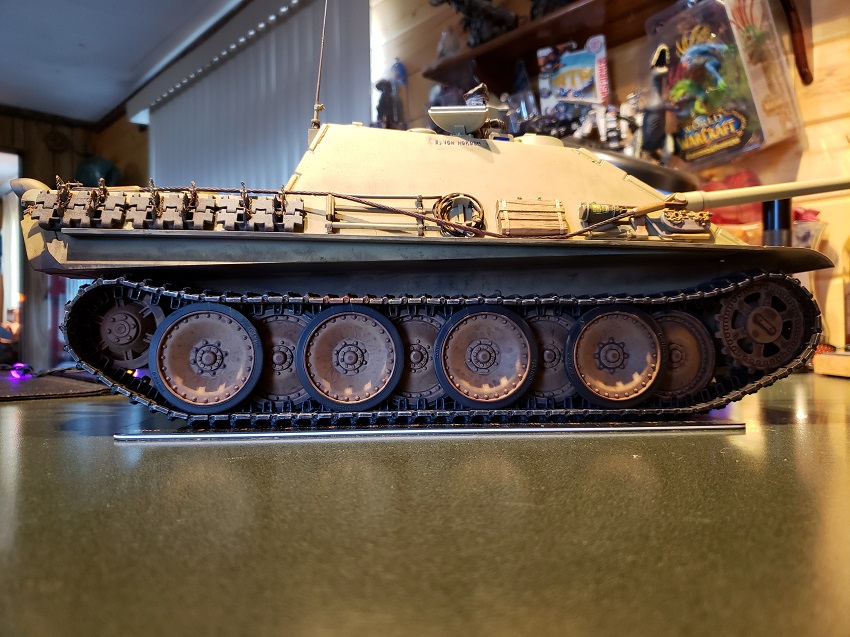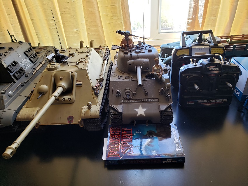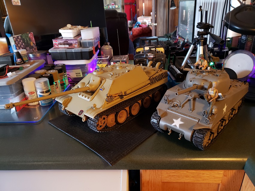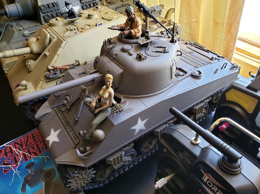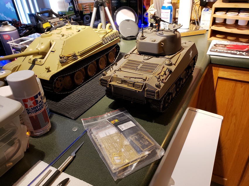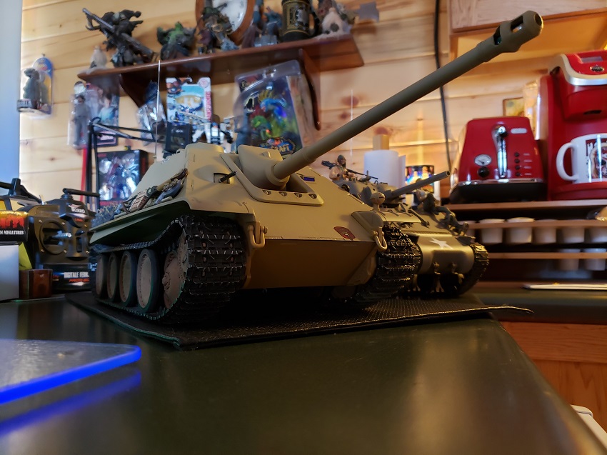 The Panzer Spirit Build was wrapped up on Friday the 12th with the cleanup and adjustment of the Sherman's adjustable Idler mounts and tracks. Final weathering followed along with another light coat of the UV reactive clear. I've weathered these tanks more than almost any other in my collection save maybe the early Stug III or Pool's 'In The Mood'. Had to as per the Novel, the Jagdpanther had sat in a forest clearing for 40-odd years and the Sherman was sealed up in a cavern full of tank building machinery by the Nazis. The Jagdpanther "cleaned up well" despite the "rusted engine grill covers and fittings" while the Sherman was "basically intact with a light patina of rust" I think that they turned out well and that the Author, Tom Townsend, would be pleased. Here are a few final pics of the work. I am currently awaiting a strong black light bulb in the Post to do a video and showoff in the Forum and close the books on this book based Build.