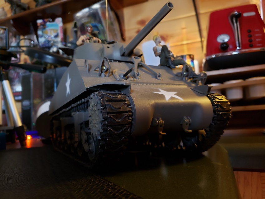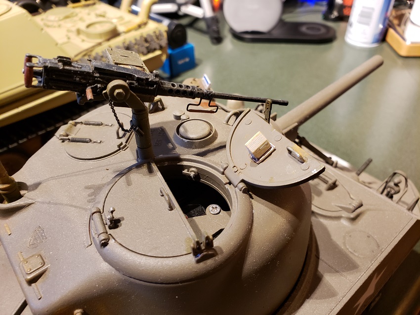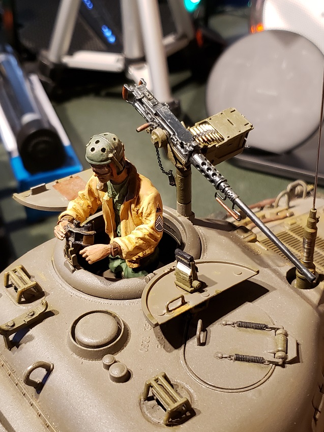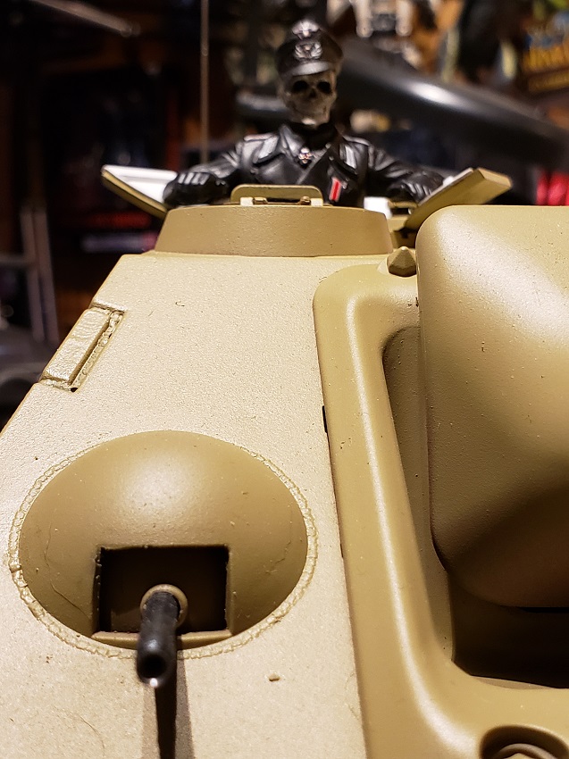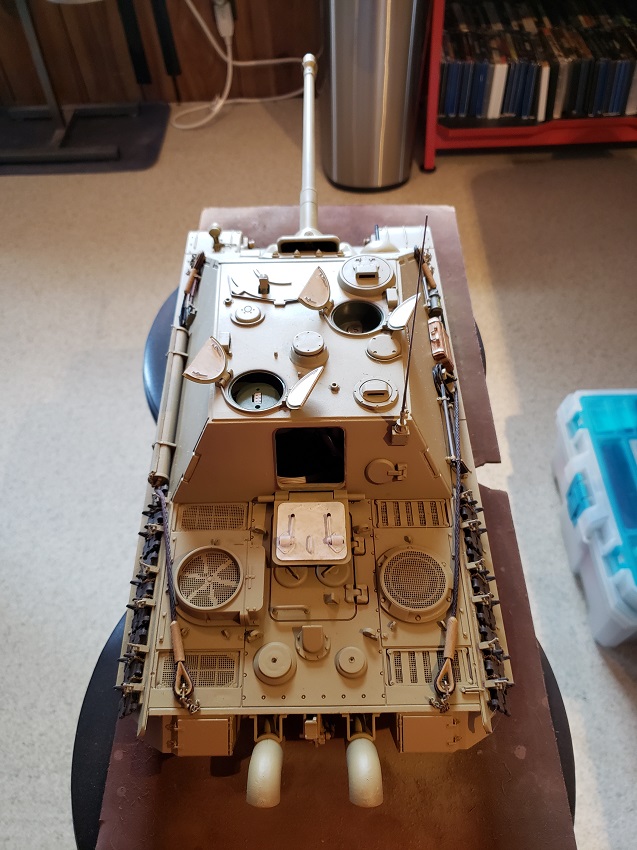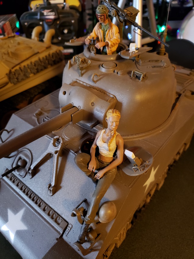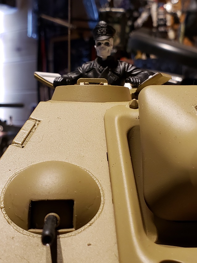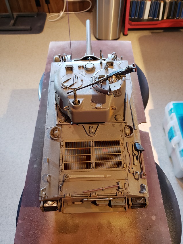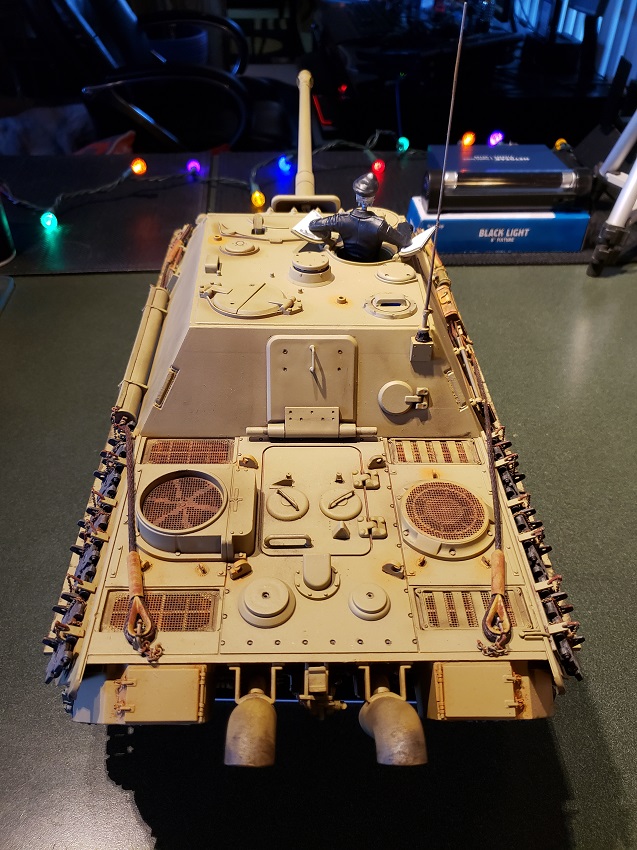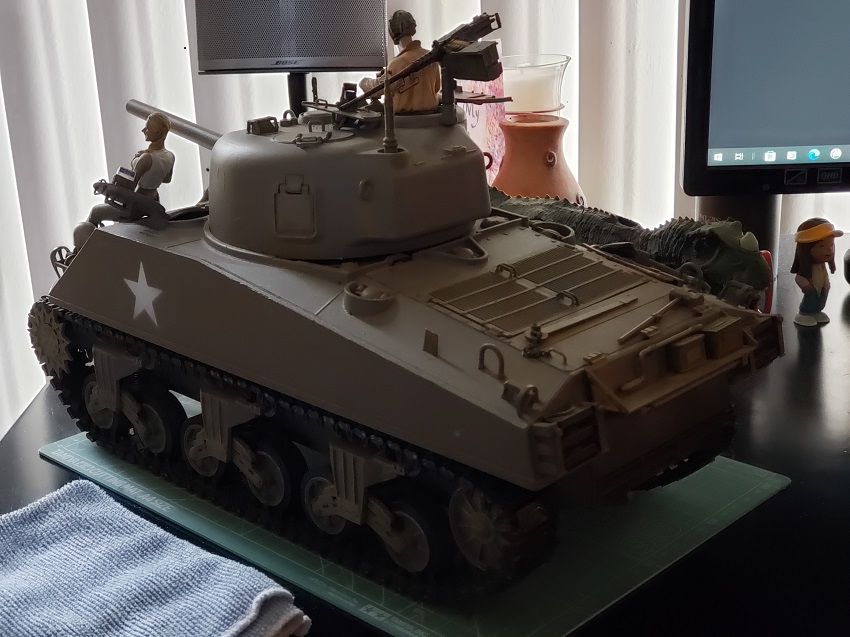 The Panzer Spirit Build was wrapped up on Friday the 12th with the cleanup and adjustment of the Sherman's adjustable Idler mounts and tracks. Final weathering followed along with another light coat of the UV reactive clear. I've weathered these tanks more than almost any other in my collection save maybe the early Stug III or Pool's 'In The Mood'. Had to as per the Novel, the Jagdpanther had sat in a forest clearing for 40-odd years and the Sherman was sealed up in a cavern full of tank building machinery by the Nazis. The Jagdpanther "cleaned up well" despite the "rusted engine grill covers and fittings" while the Sherman was "basically intact with a light patina of rust" I think that they turned out well and that the Author, Tom Townsend, would be pleased. Here are a few final pics of the work. I am currently awaiting a strong black light bulb in the Post to do a video and showoff in the Forum and close the books on this book based Build.