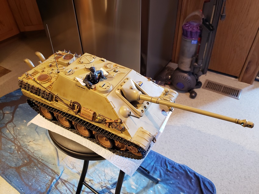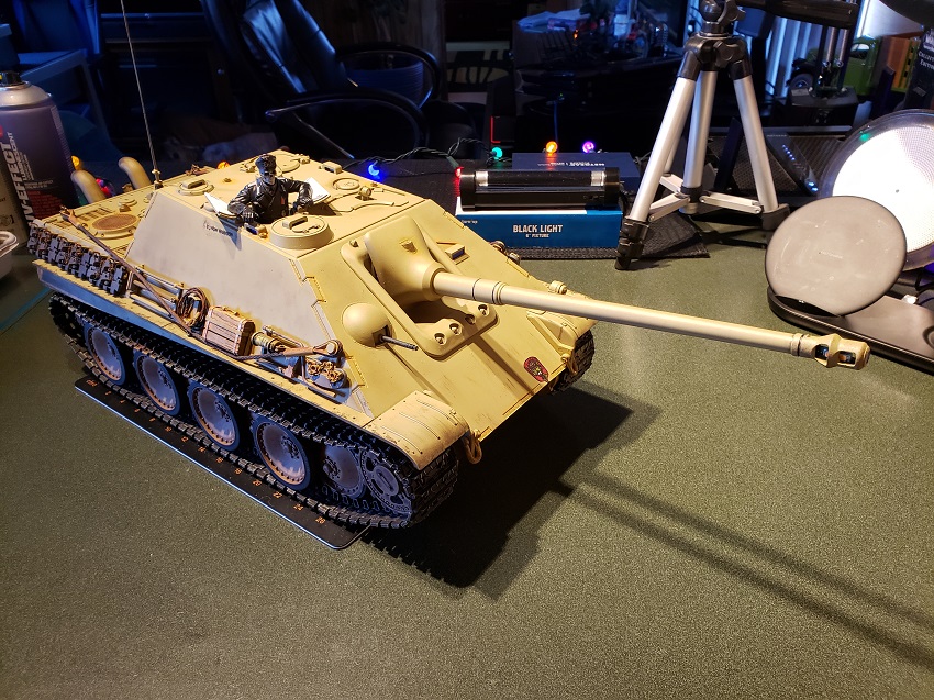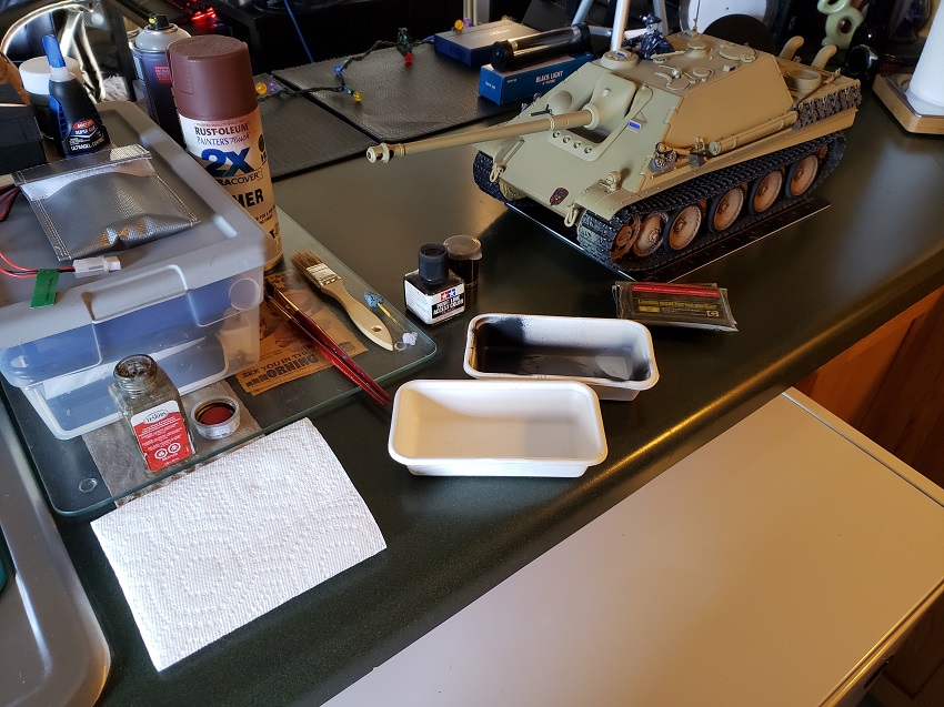 Spraying the Jagdpanther with this clear flat that glows Blue under UV Light..jpg
