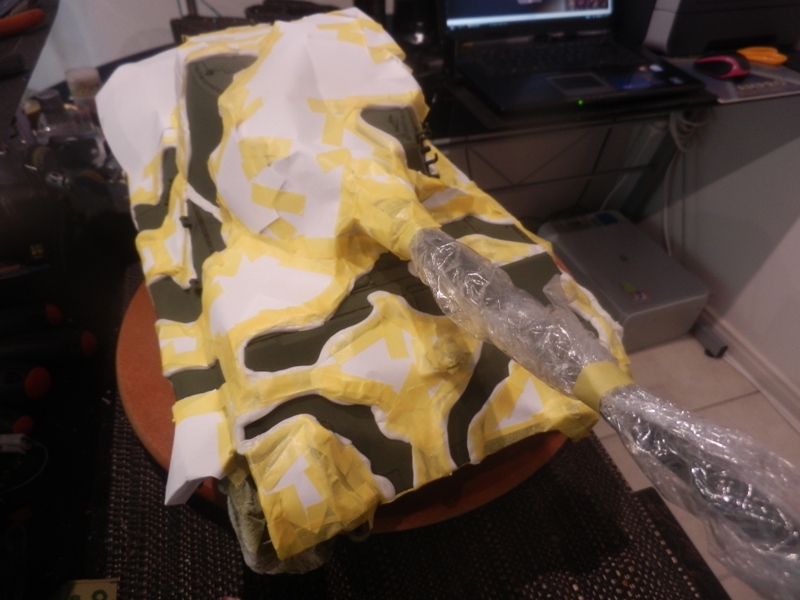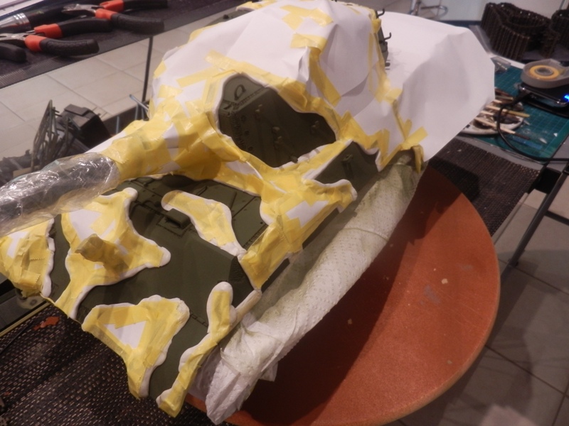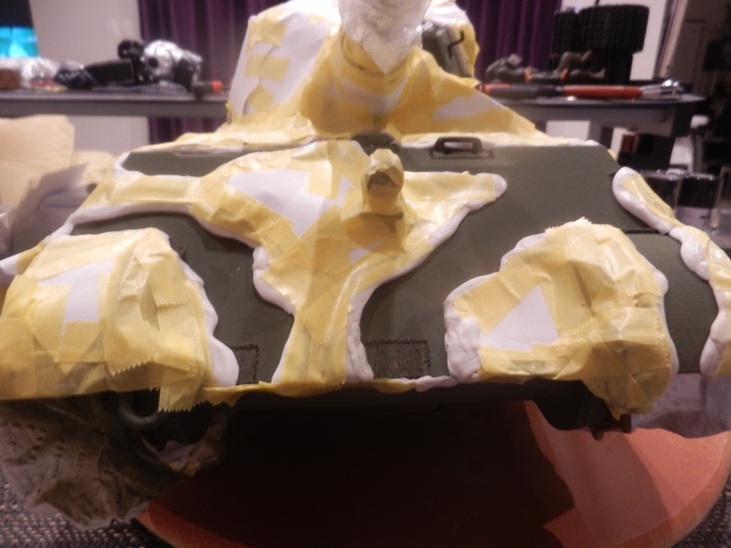 Due to the pattern, I can mask only the turret and front 2/3rds. I will do the rear section once the Gelb has settled on the masked sections.