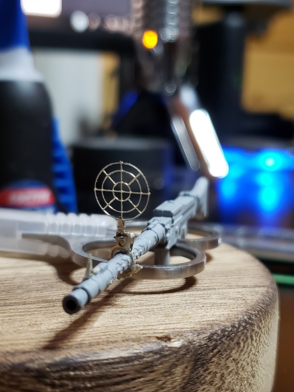 Not feeling the best after a restless night and fever and scratchy throat today ( it is entirely possible that the current Bug made it's way home from the Hospital where the Mate works and found my aged arse-ola. I will keep a weather eye on my health and get tested if needed ), I decided to do some sit down work at my desk with PE. This anti-aircraft sight is the best fun you can have for 3 euros. Unless you are a solder genius like Barry or Louis on the Forum here, I suggest using a Super Glue gel to assemble the microscopic bits of this tiny brass kit.