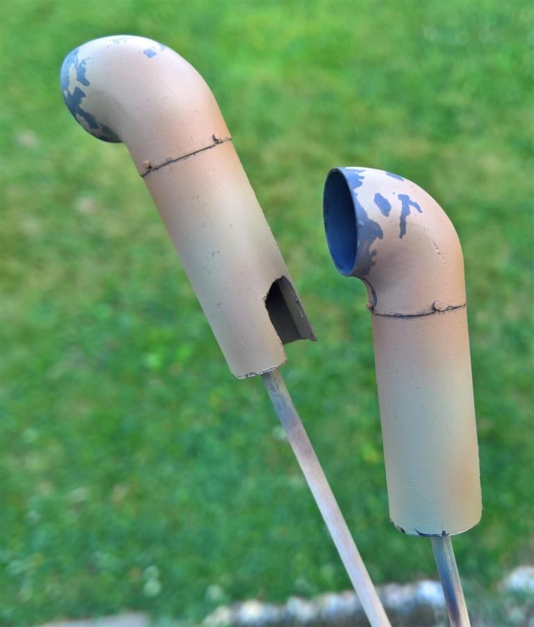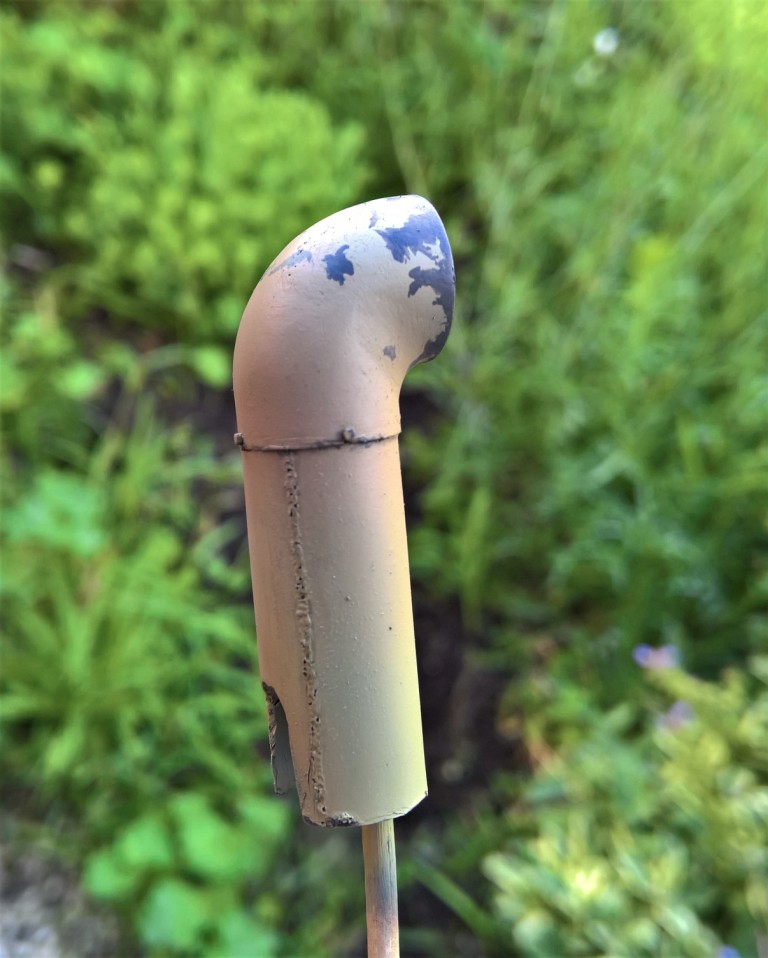 So I build up a Gradient of discoloration, First starting with my own Dark yellow mix (50/50 7028 and 1001) and then added a view Drops of Vallejo Rust 71.080. After That a mix of 7028 and Mahagony 70.035. So first getting yellow orange, then yellow orange Brown, then I followed with Mahagony in thinner and ended with dark yellow in thinner. That is the intermediate and the result. So the discoloration is based on the original Colors and has a orange/Brown tinge.