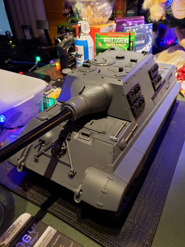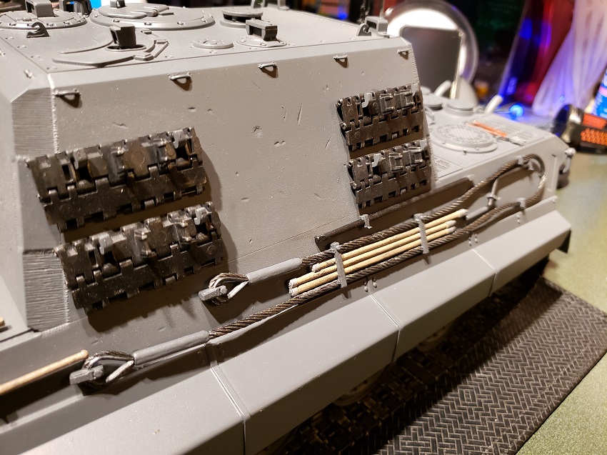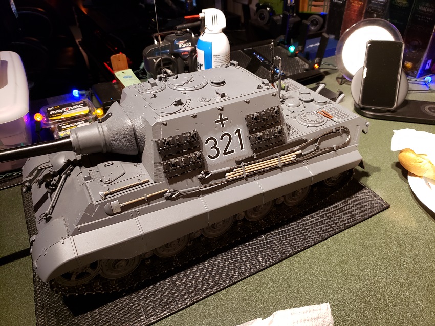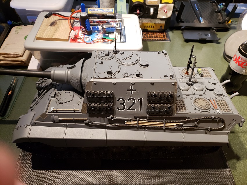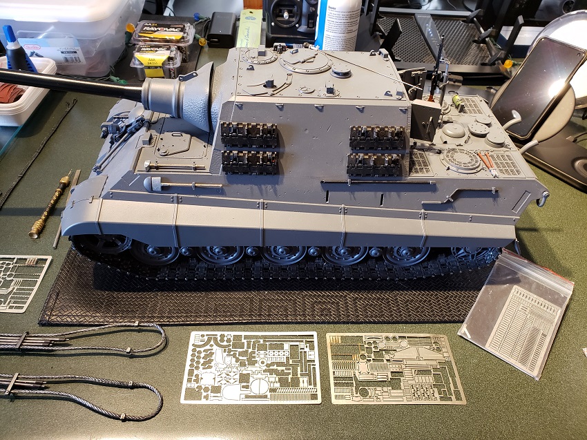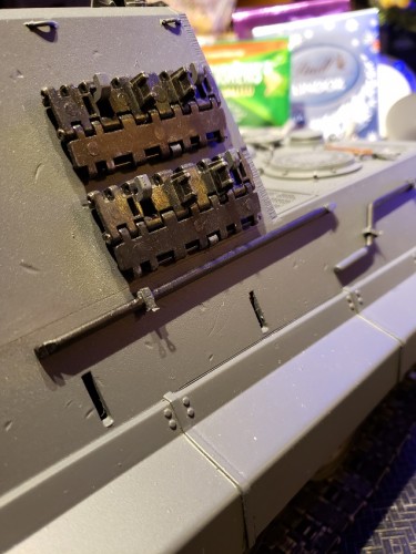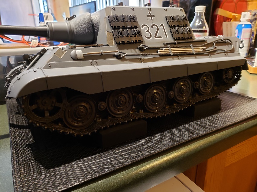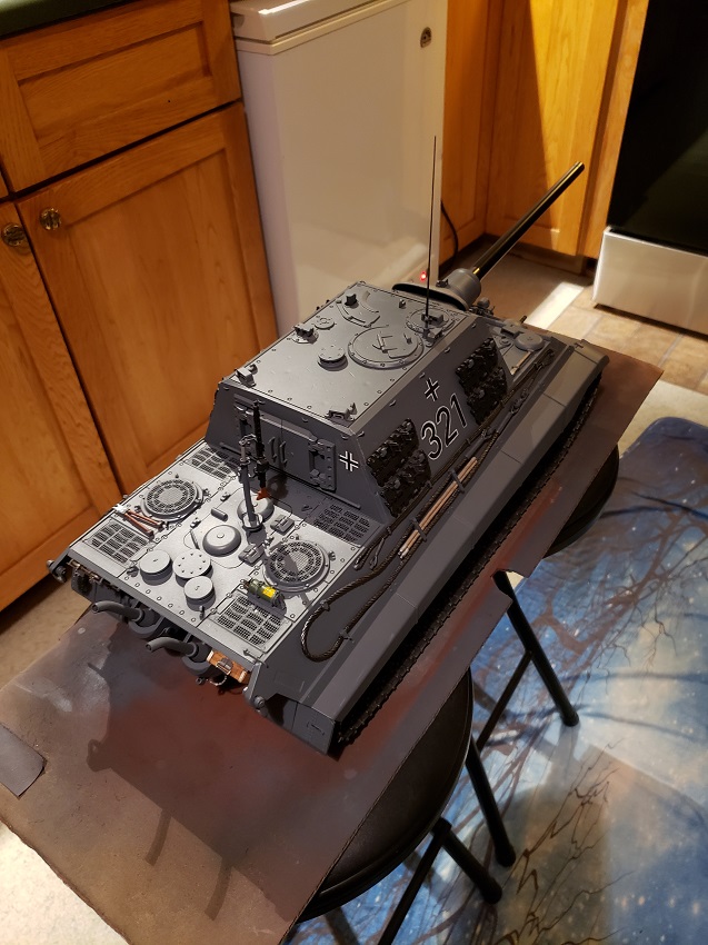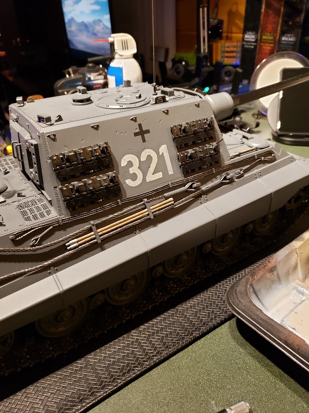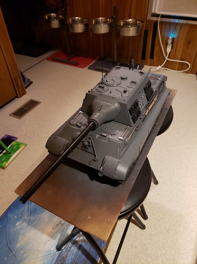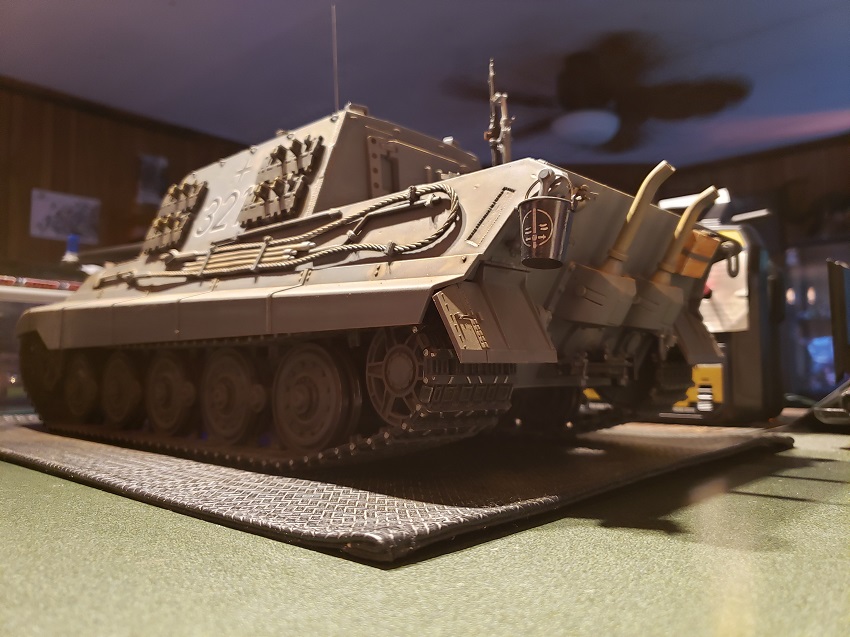 While you will find wartime photos of 323 and 322, there are no pictures of 321. The closest I got to a reference was Volume 2's note that the vehicle was destroyed in fighting that also saw the loss of 323 and 322. Lost to History. Gives me a bit of leeway to show it depot fresh with all the guards and the Unit marking plus the black main gun barrel. Having it be Grey ( like an old WWll photo) is just my artistic license. Thanks for looking in my Friend. A little more to go before turning my attention to Sherman's and Jagdpanthers.