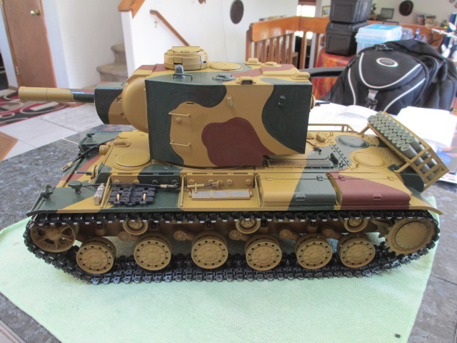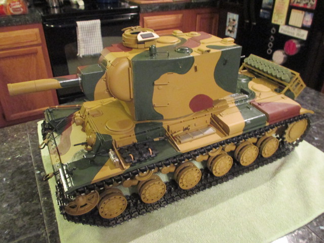 CH, thank you, Sir, for coming round and kicking the road wheels. ;o) Herman, it was like painting a building, just one with rivets, bolts and weld marks all over it. I had planned to leave that yellow section on the left for stenciling and unit markings but after some good advice from you all, I broke it up some. Detailing is ongoing and I am pleased with progress. ;o) Alpha, I used my mental pattern and followed your advice. It does look more balanced on the one side. I did not do any additional painting on the rest of the vehicle, just continued the seemingly endless job of filling in light spots and nicks and tiny missed spots under rims and bolts, etc. The KV-2 is a gigantic vehicle. Pictures: