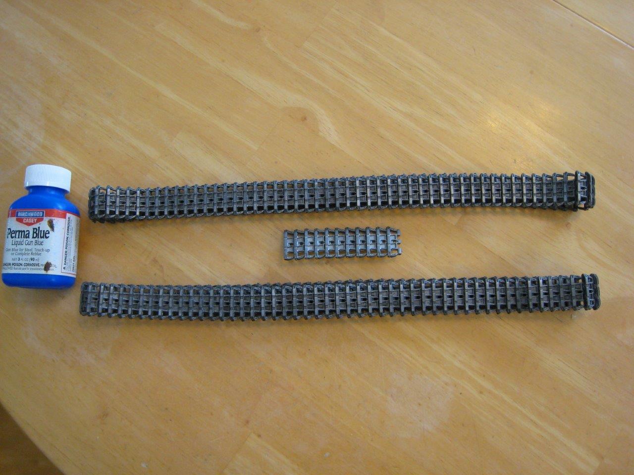 Last thing I did was to darken the tracks. Frankly, this was an accident. I had some gun blue and I thought I’d take a little of the edge off and darken them slightly. Well, they ended up black, which wasn’t what I wanted. Since they blacken as a result of a chemical reaction with the metal, I figured I could recover it by scraping off the outer surface similar to removing rust. So, I wire-brushed the tracks. Now, they’re more of a blackened silver. I like it a lot better. Once I get them on the tank I’ll decide if it’s a technique I want to use again.