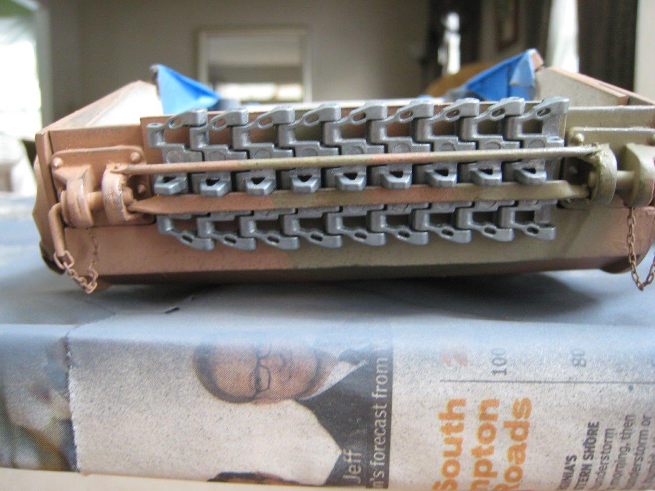 I fixed the spare tracks in place. Before I did that, I wanted to seal in the paint job. So, I applied a coat of Testors Dull Cote. I was concerned about the rubbing of the tracks rubbing off the paint. A word of warning (and reminder to myself) to anyone planning to use Dull Cote over an acrylic paint job. Apply the Dull Cote in several light coats rather than one medium coat. The lacquer Dull Cote attacks the acrylic paint. I’m sure I read that somewhere, but completely forgot. Oh well, lesson learned.