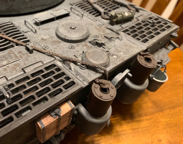 Today I received the Mato metal pistol port and installed it on the right side of the turret. It’s another one of those details that really identifies this as a very early initial production Tiger. I also added the wiring conduit and brackets for the headlights and for the smoke launchers. I still need to add wires to the rear of the smoke launchers.