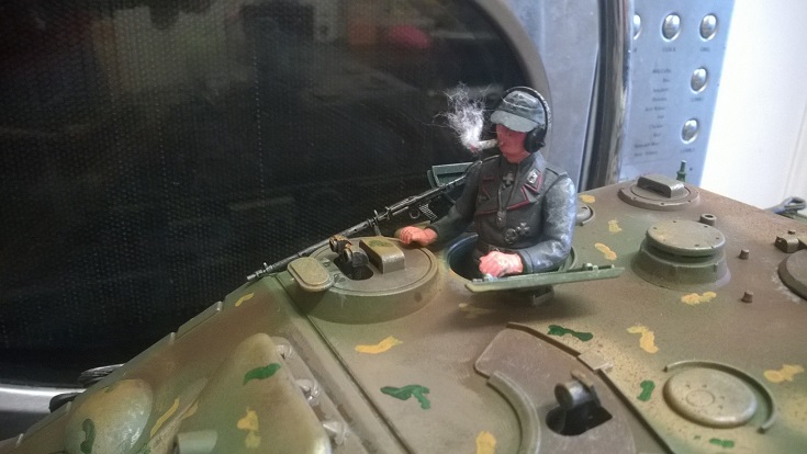 Rest of the accecories fitted and dry brushed aluminium along with a dusting of pastels.. Then it was on painting my commander. Done him in a Humbrol Dark panzer Grey with dark red pin striping and silver medals.