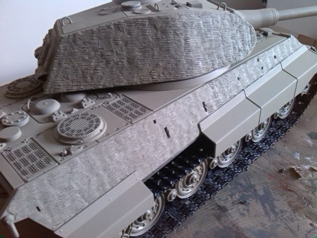 I managed to get the zimmerit completed, it turned out ok, and by using milliput it hardly cost anything at all. I prefer that uneven look as opposed to the uniform pattern that the Atak panels would have looked, it took forever to do though. A coat of Vallejo WW2 German Beige mixed 30/30/30 with matt varnish and water and it all came out quite nicely.