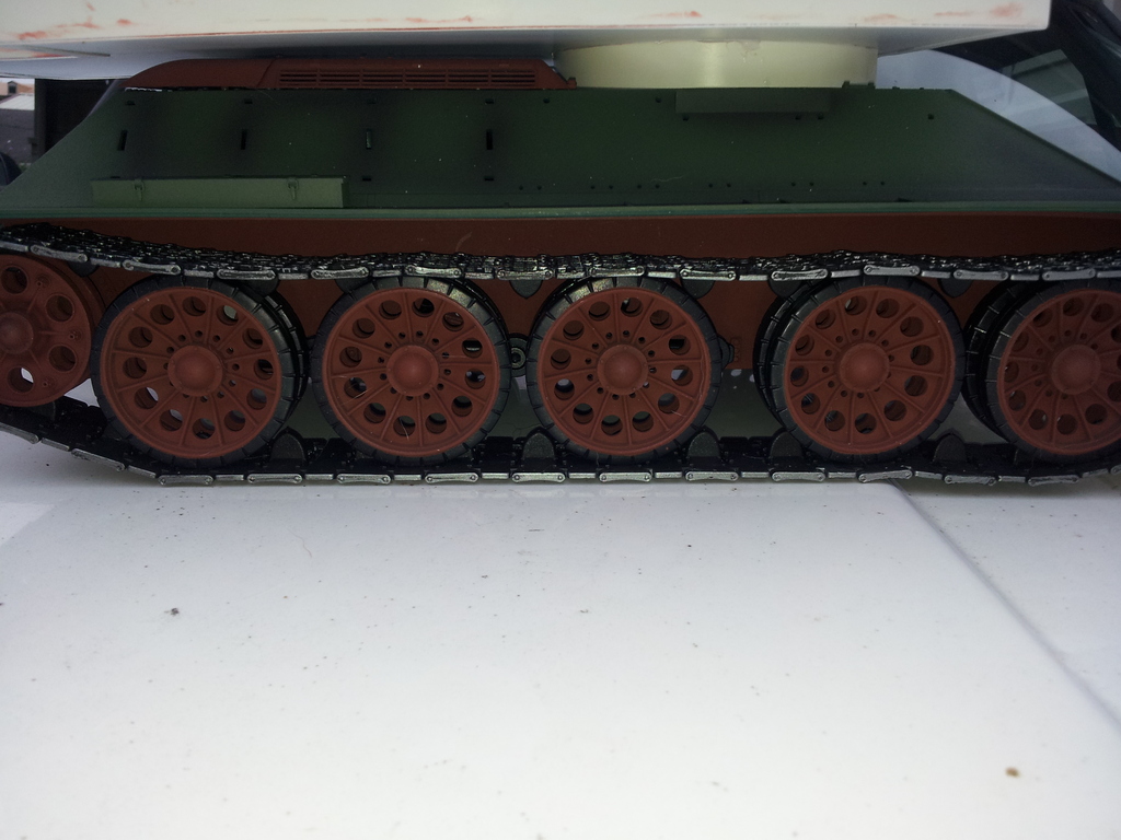 A quick way to adjust the ride height is to actually put a small piece of styrene into the suspension arm stop so that it will stop higher than factory height. This will reduce the travel of the road wheels but will give you the proper ride height with very little work. The whole point of the Christie suspension originally was that the upper of the road wheels act as the return roller so the tracks should really be touch the top and the bottom of the road wheels.