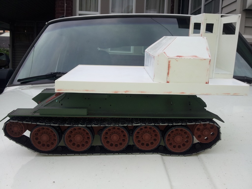 I'm sorting through the hull fittings to see what I want to put on. The rest of the holes will be filled and textured with putty. Also found a couple of good pictures of the control panel. Also made use of some leftover tread plate to put on the deck and control cab.