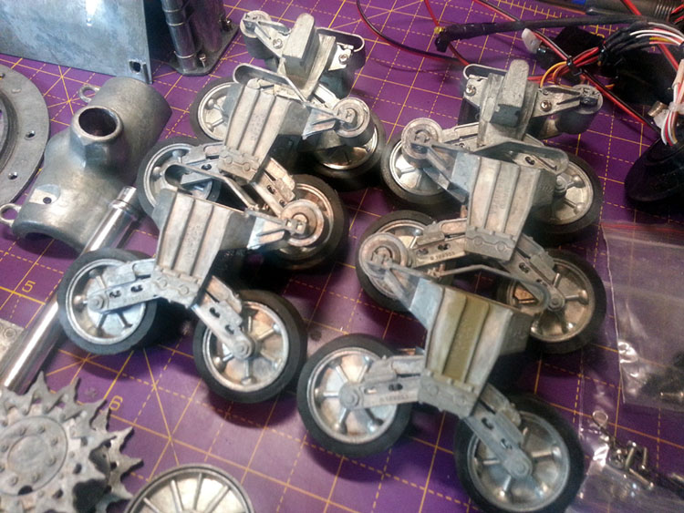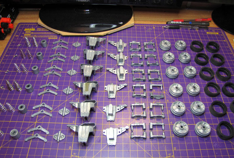 And here they are stripped to their component parts. I'm going to keep them as matched sets so I can ensure each wheel works perfectly with its corresponding axle and hardware - probably overkill but I want to avoid any future binding if I can. If I had the tools (I don't) I would have liked to drop bearings or at least bushings in but, as it is, that option isn't open to me at present. There is also some flashing and mold lines/marks to clean up......
