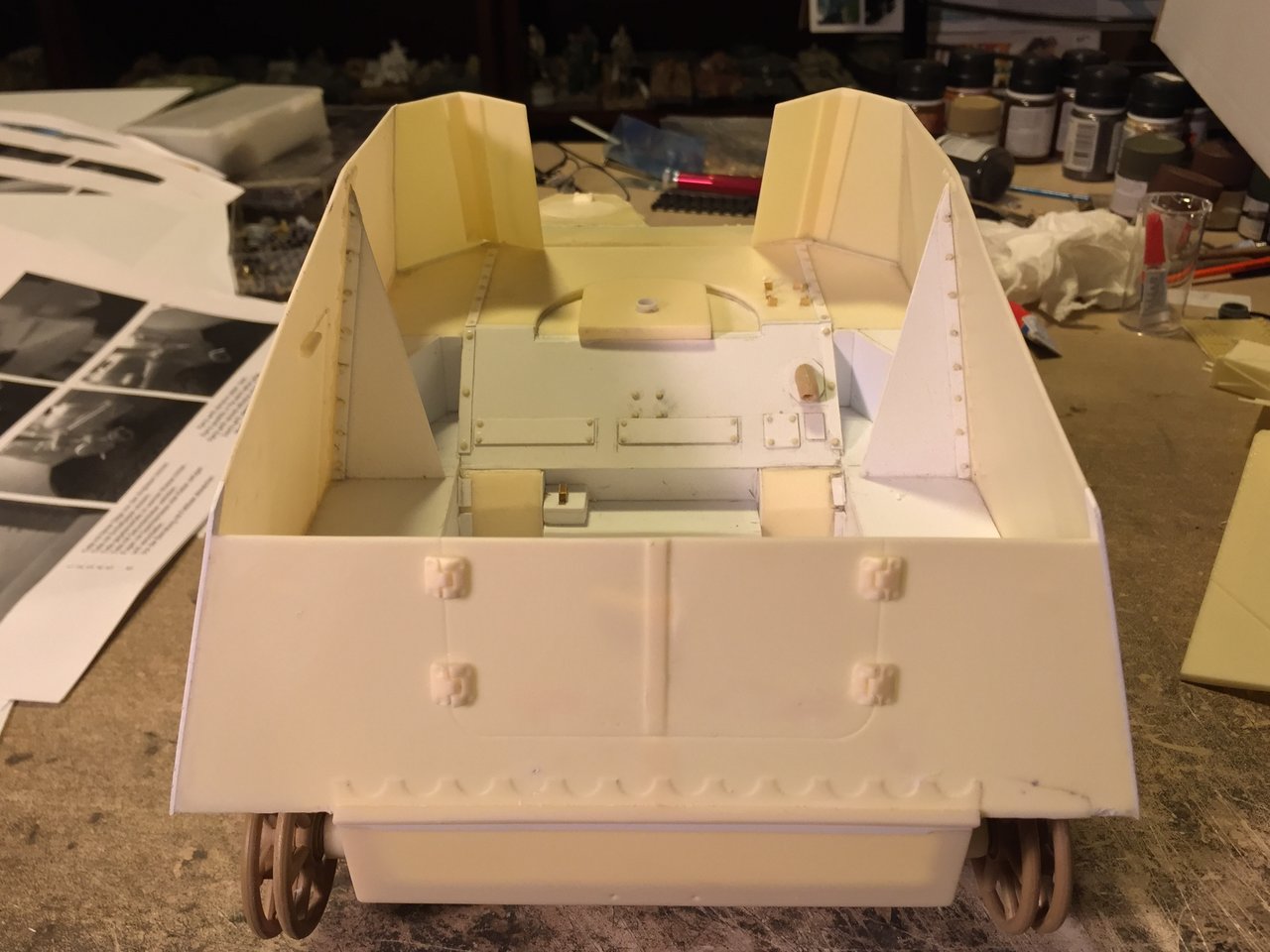 Also started on the interior. Now, this is the area where you do not want to follow the instructions. It's wrong. I wonder why Juckenburg created very accurate and nice parts like the glacis and the gun, and then invent other parts. Look at the interior picture provided on the instructions. I have never seen an interior arrangement like this. The radio is too big, it is mounted on some kind of rack and put where the support brace should be. Looks like they just got tired and botched the kit at one point, creating parts somewhat inspired but inaccurate.