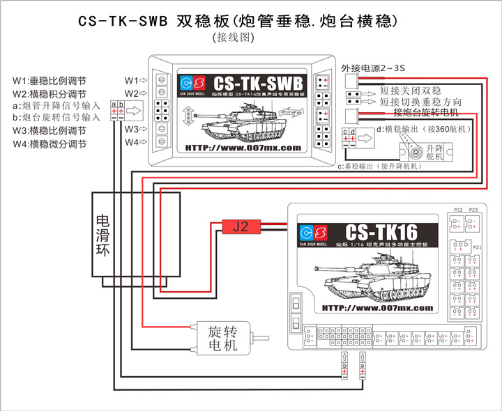 What I use on Carl's Heng Long M1 is actually a Chinese brand MFU's own stabilizer unit, which is plug and play with any servo elevation and rotation. Here is a picture of the wiring for it in Chinese (I know enough written chinese to figure out what goes where. The CS-TK-SWB is the stabilizer unit that sits in the turret):