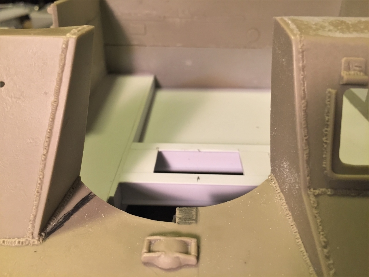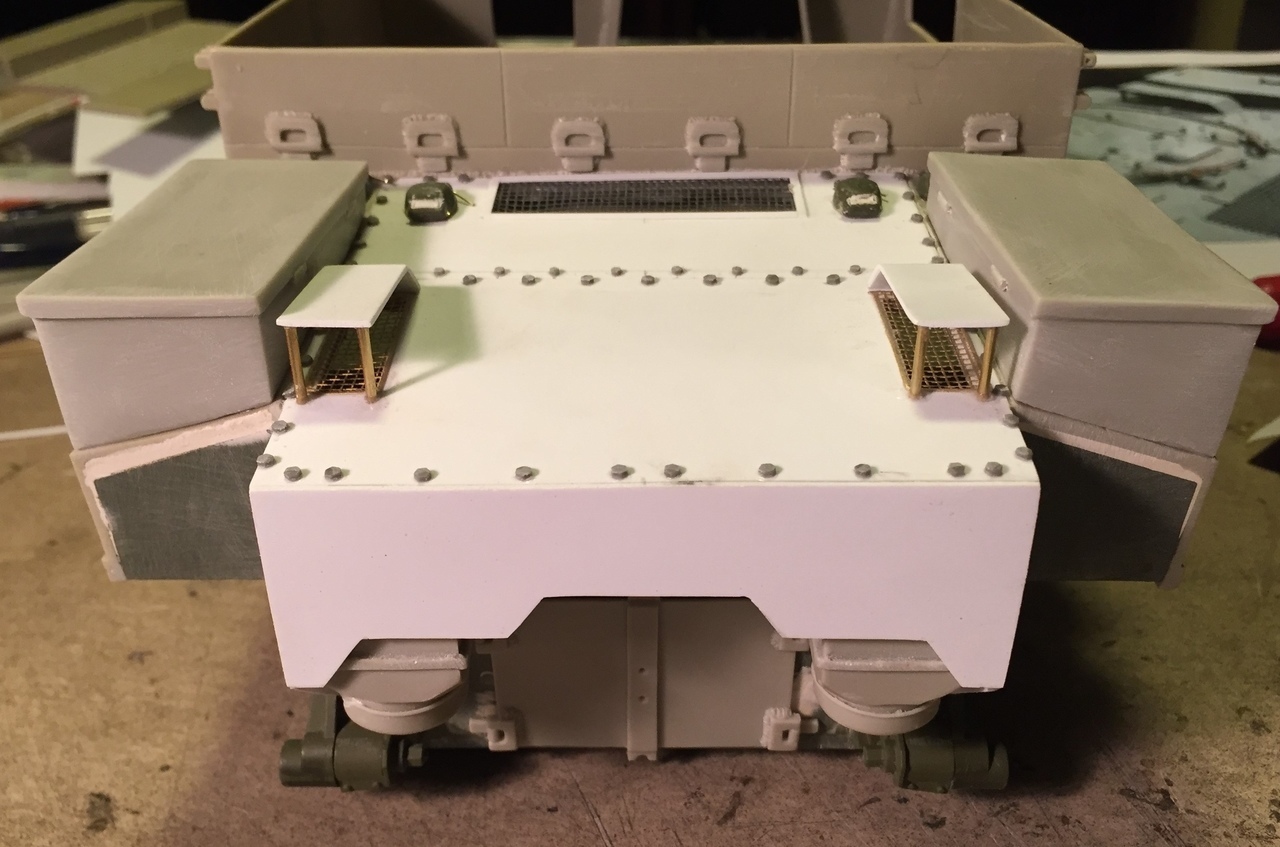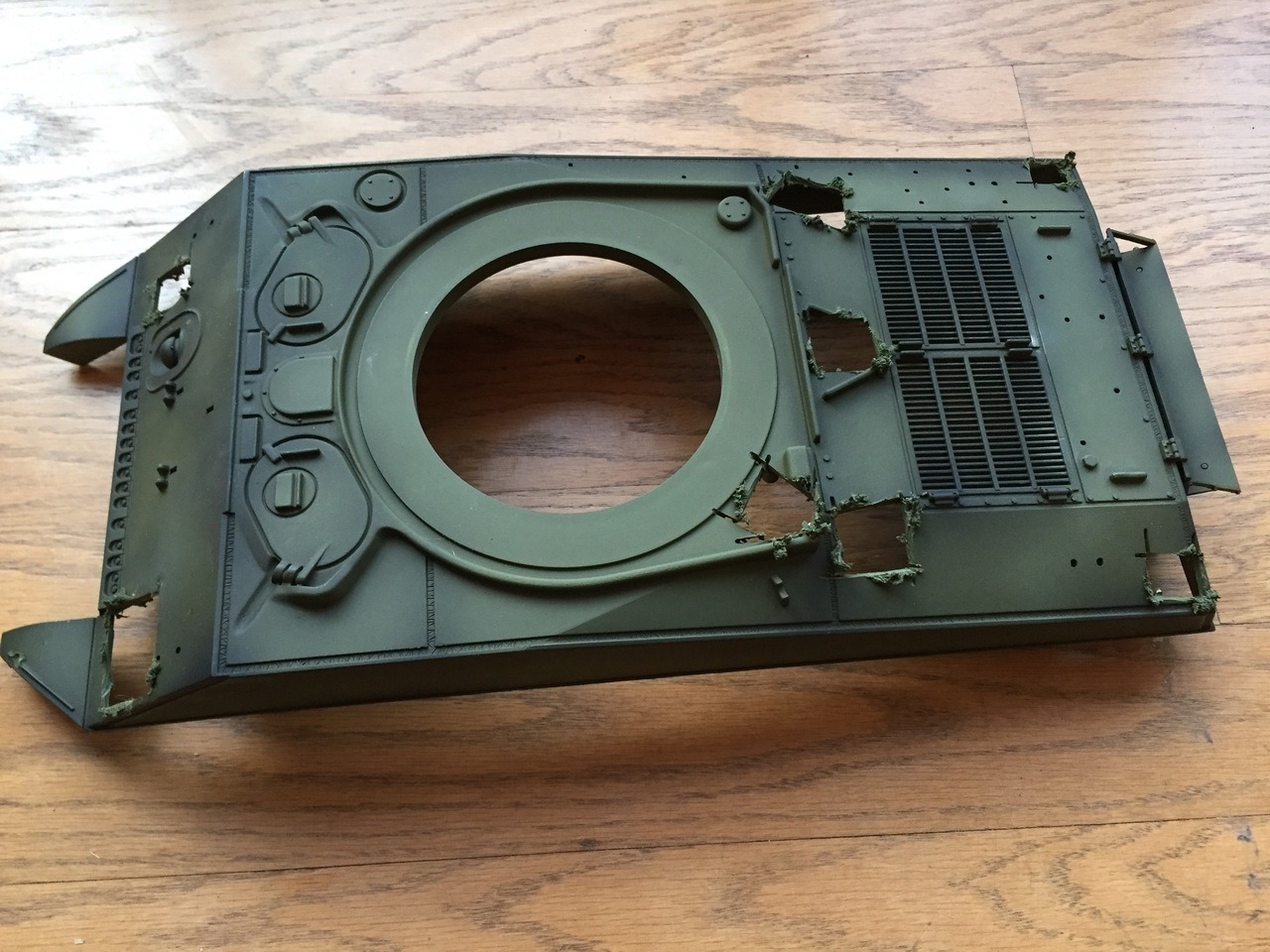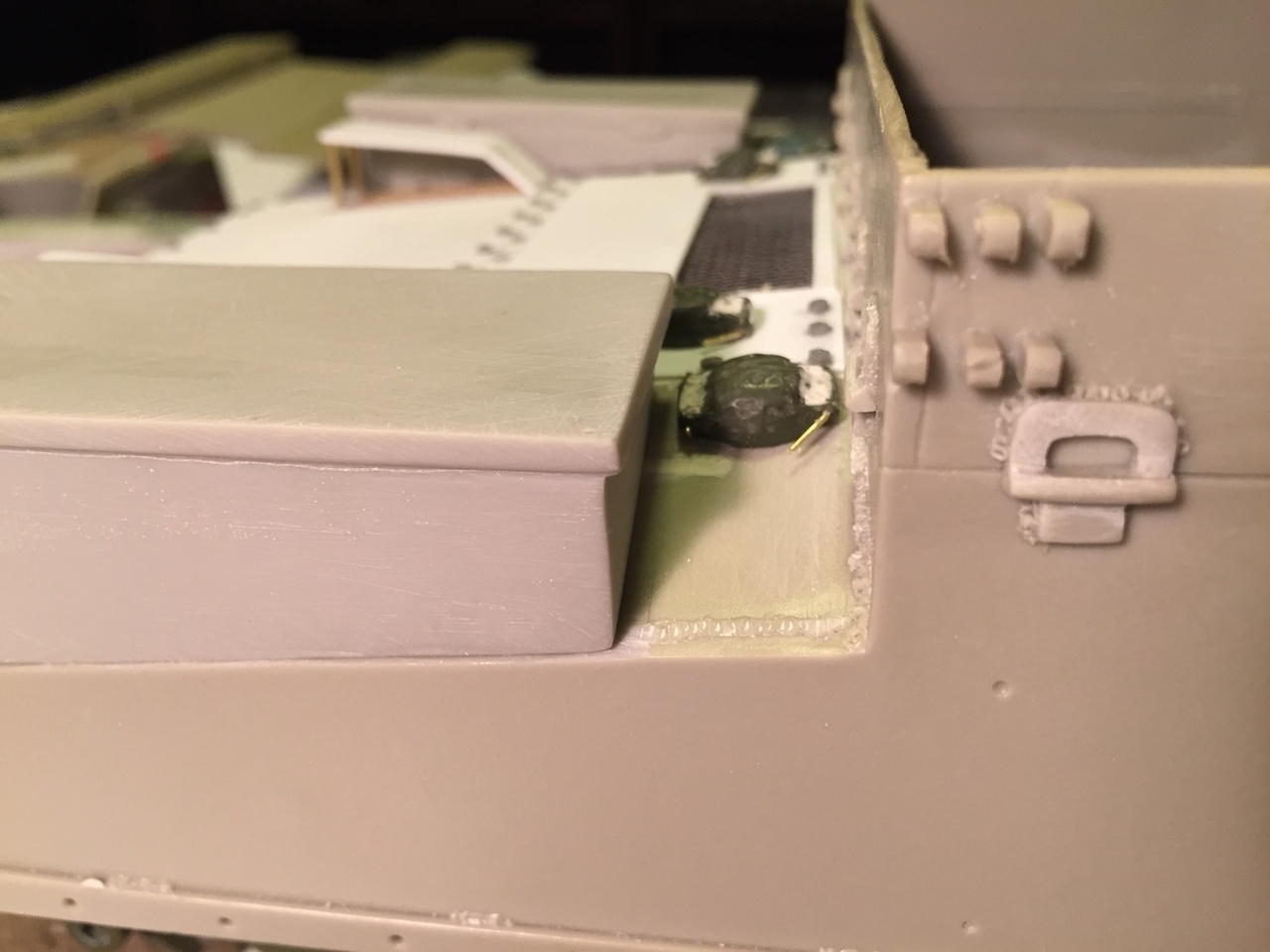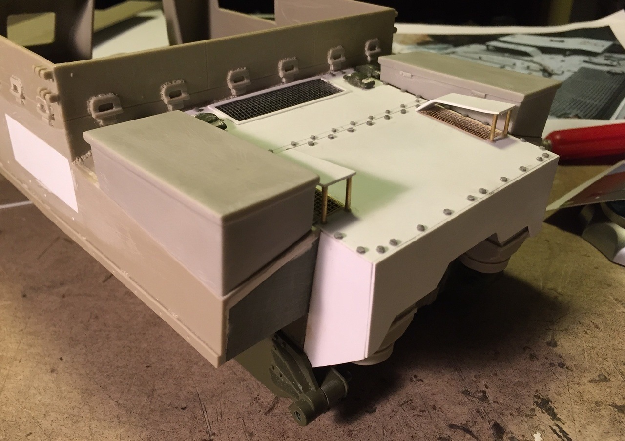The awful rectangular hole on the side armor has previously been filled with plasticard. The vendor should not have done this... There is no purpose to it. The lower rear kit plate was re-use and sanded smooth for future detailing.