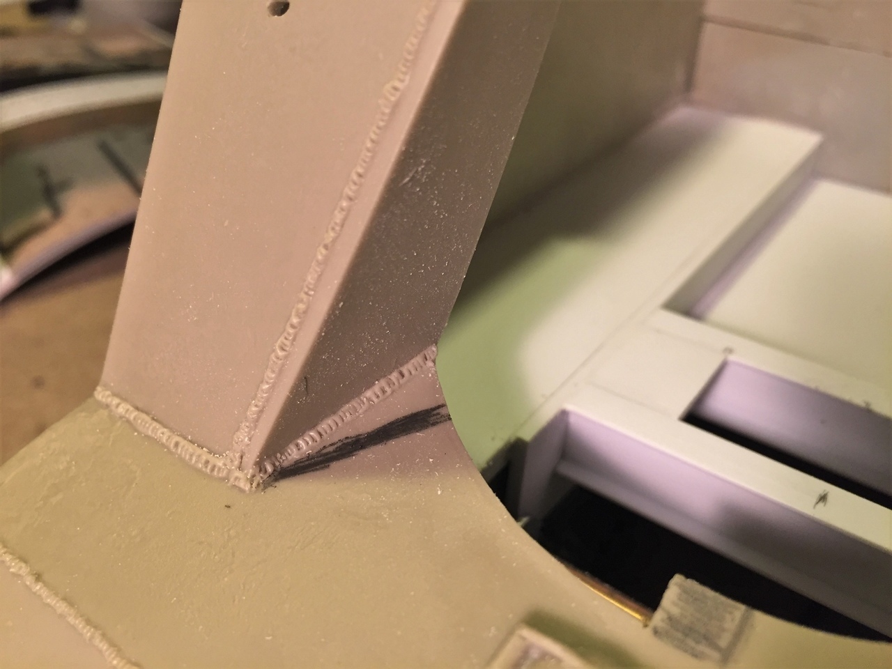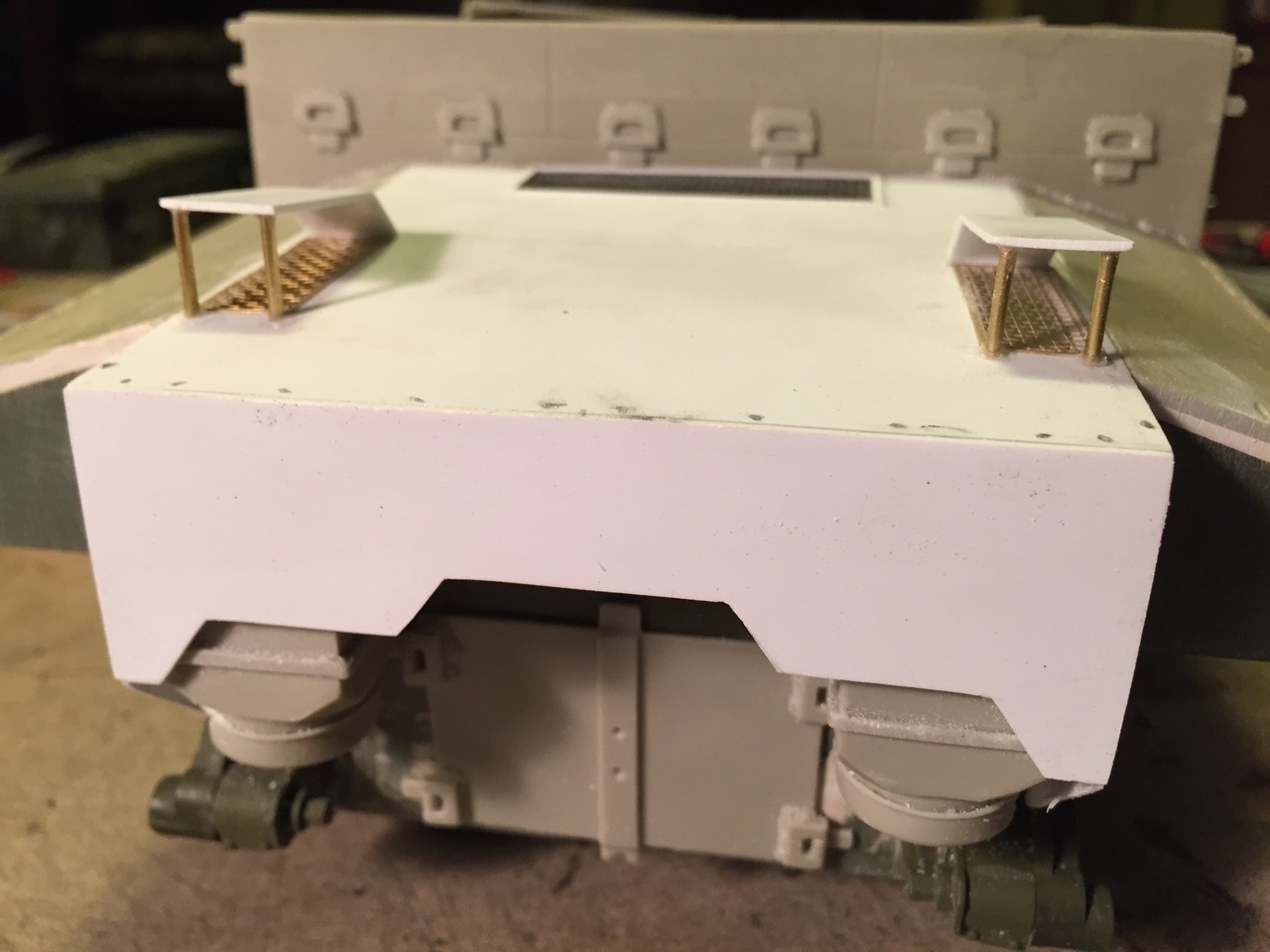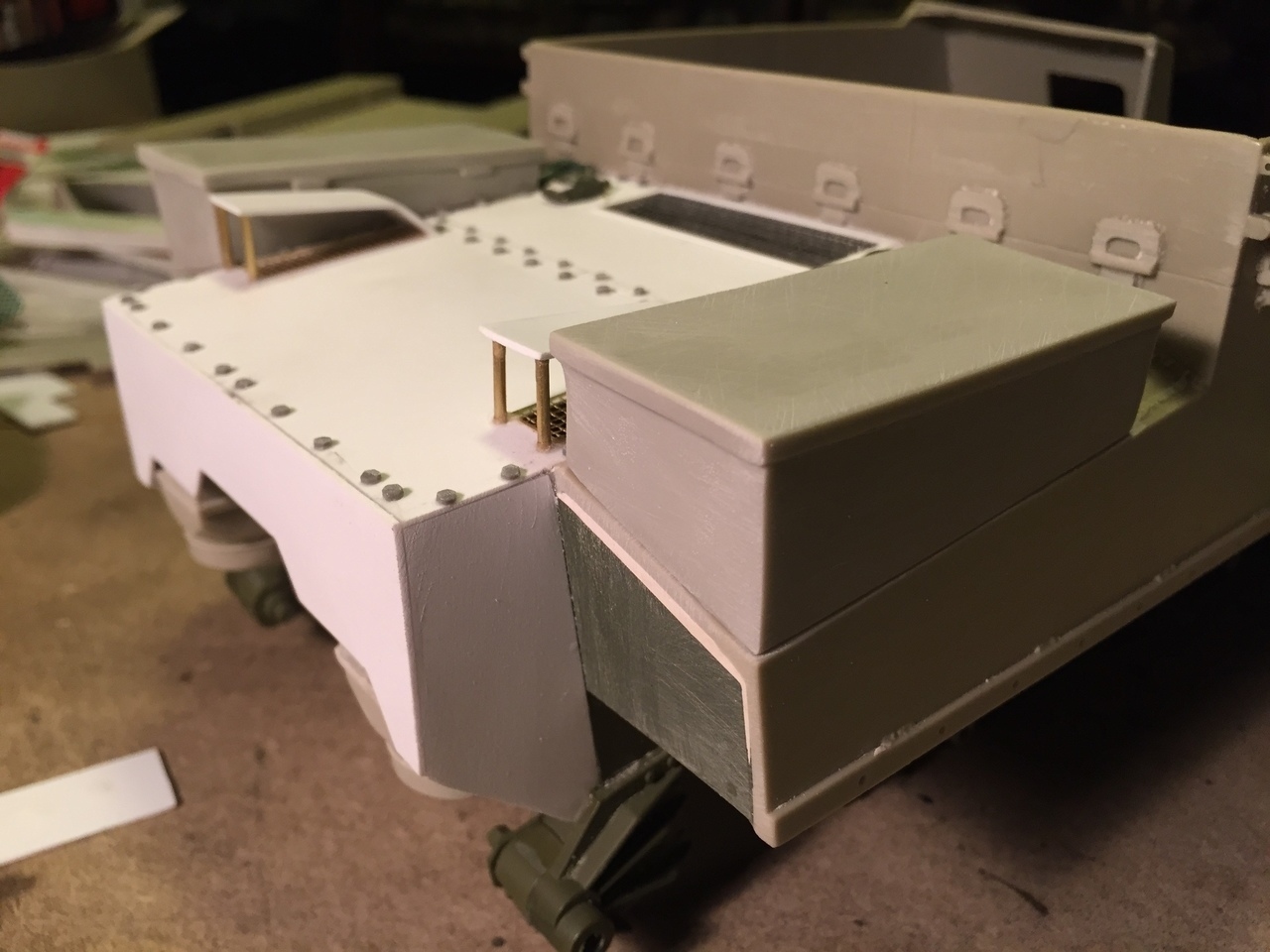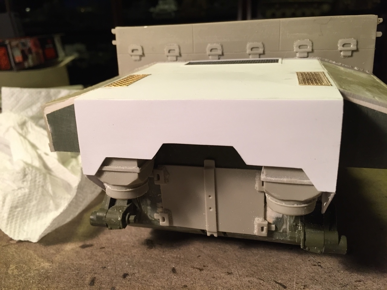 The awful rectangular hole on the side armor has previously been filled with plasticard. The vendor should not have done this... There is no purpose to it. The lower rear kit plate was re-use and sanded smooth for future detailing.