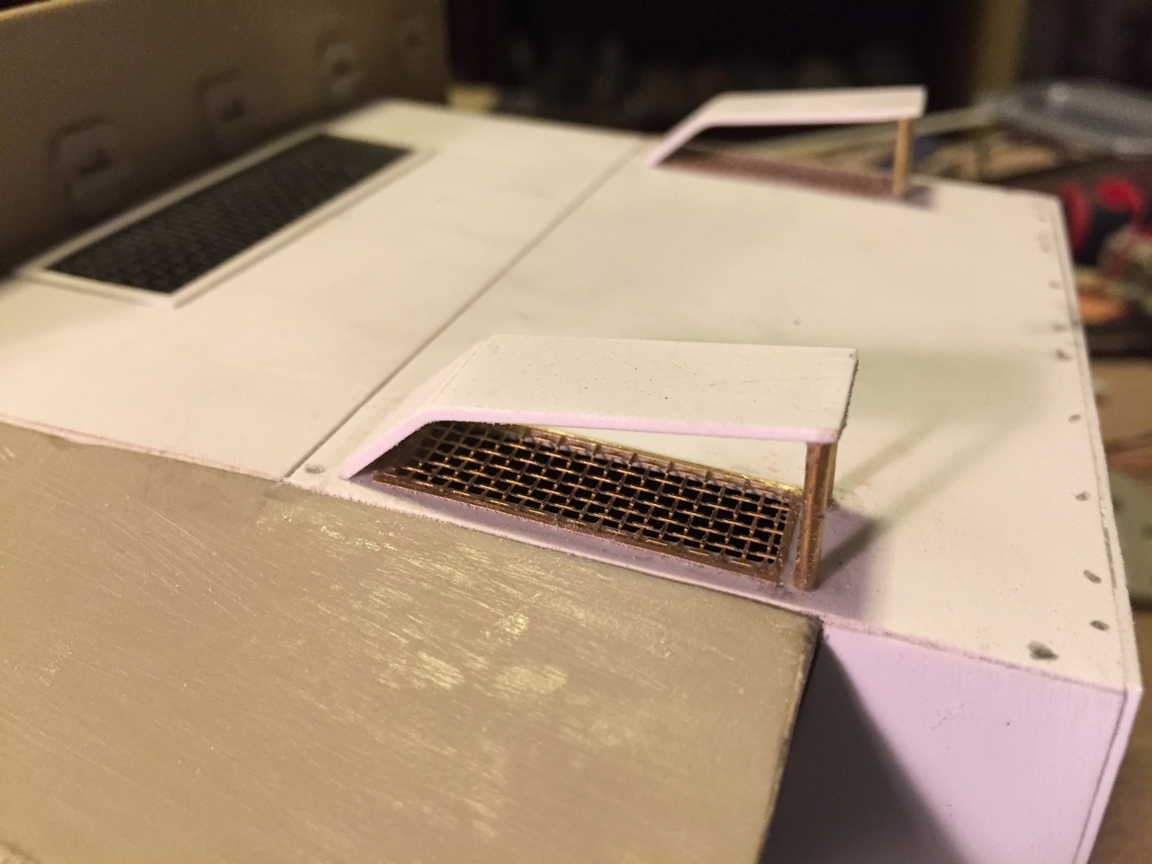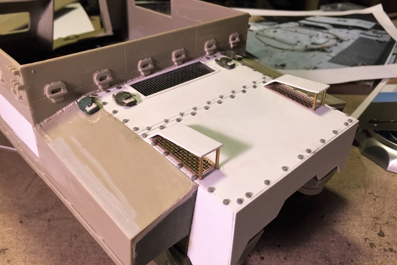 I also installed the ventilation covers. References show these 2 ventilation grills on the early and mid production Priest, in 2 different styles. The metal grills were made from leftover Mato King Tiger grills, (you know, the larger ones that go on top and we never use), cut and rearranged for this kit.
