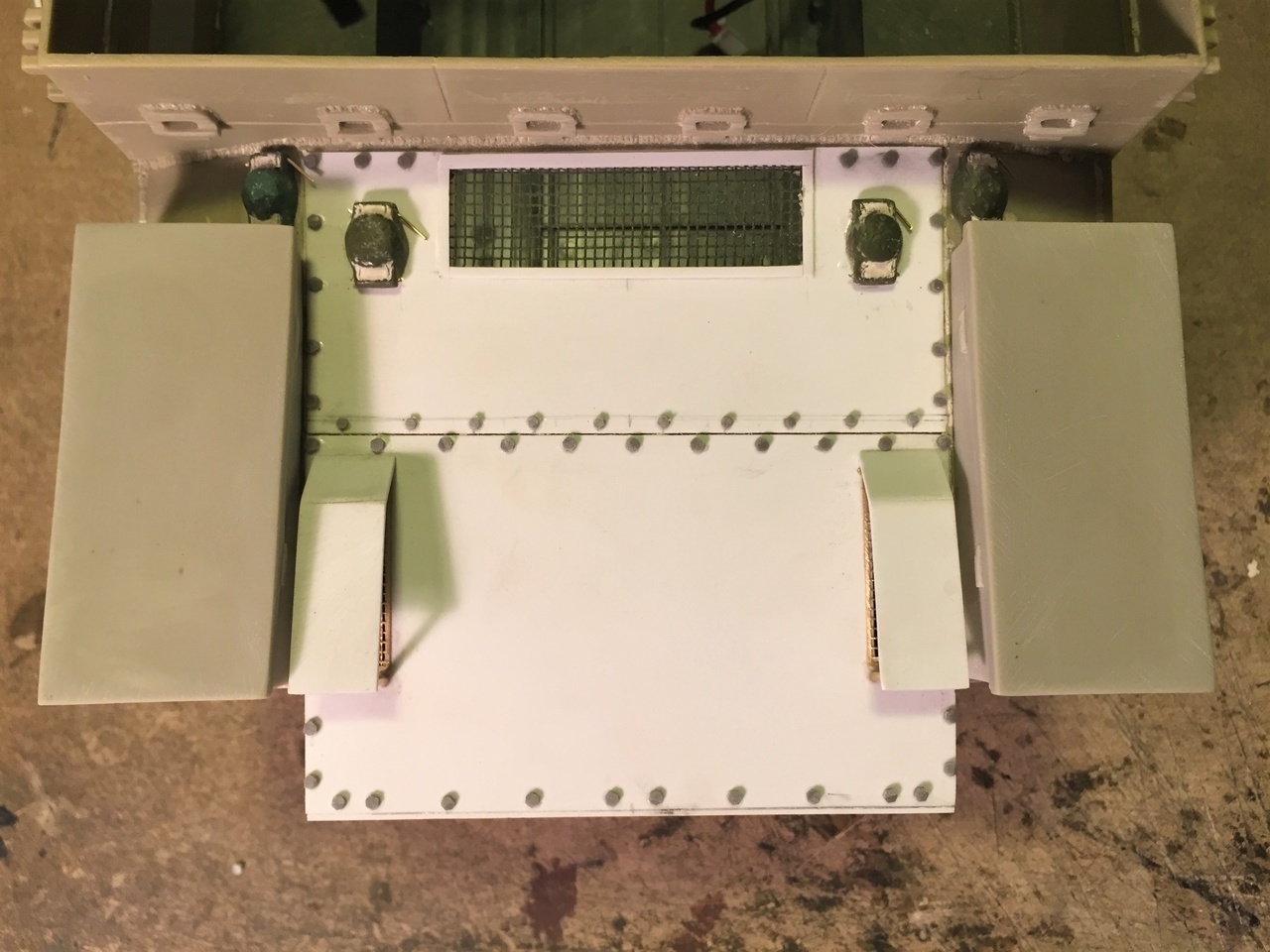 Preparation for the rear bins. The fuel caps and bolts are installed. The Meng "Large" nuts fit well with 1/16 scale tanks.