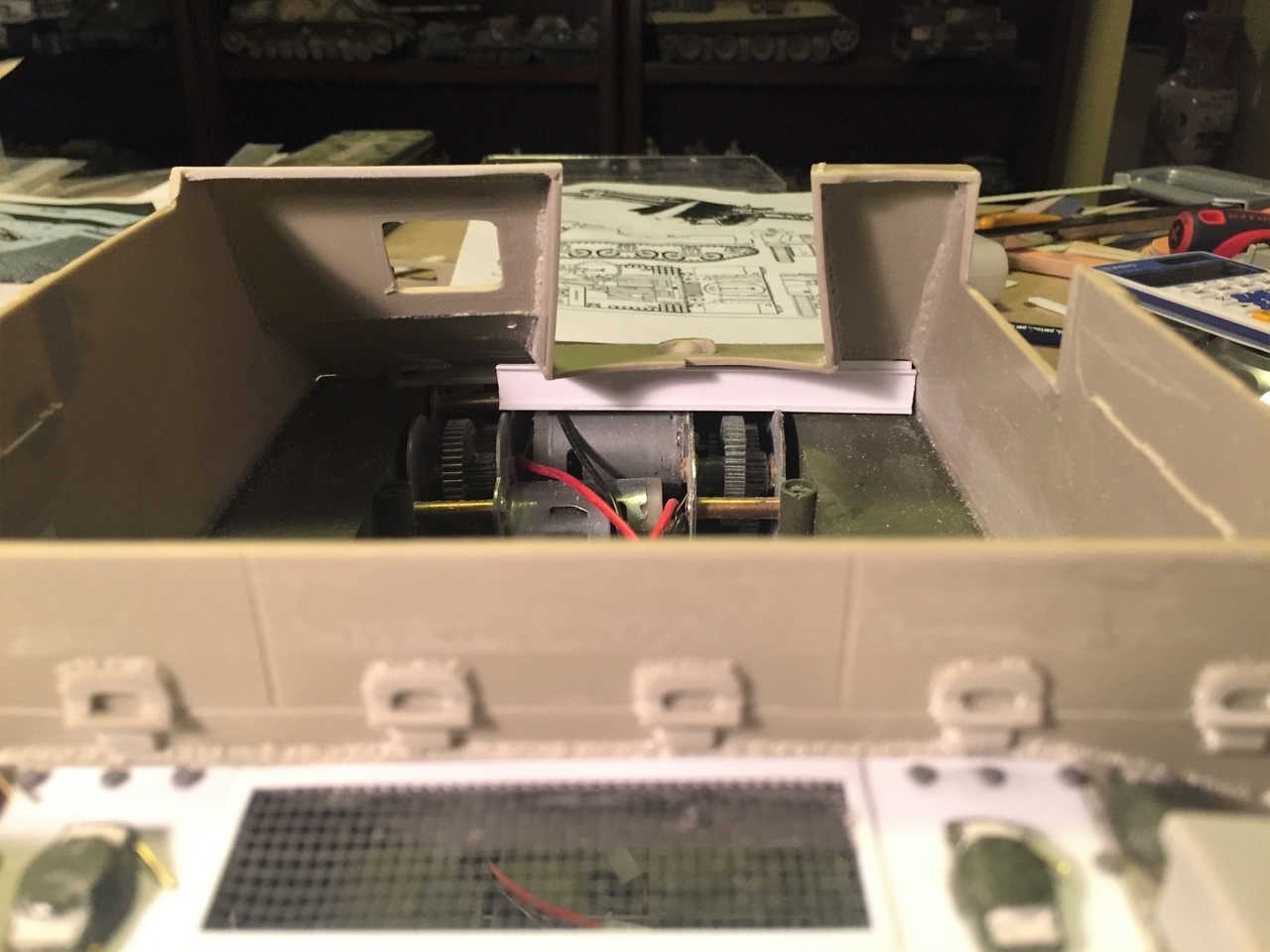 New full length sides are created from 2 layers of 2mm plasticard that are 34mm wide, going all the way to the front. The Vandra upper hull exterior side armor is higher than scale so increasing the height of the floor in a similar way as the discarded kit part is necessary to maintain proportions. Otherwise, the floor will be too deep in relation to the top of the armor. It helps also to keep the gearbox lower.