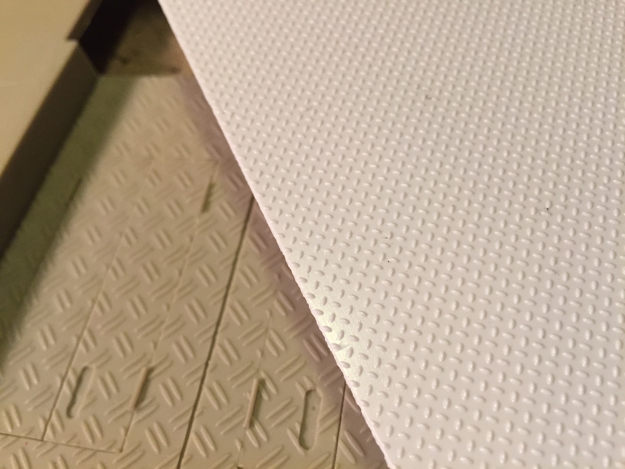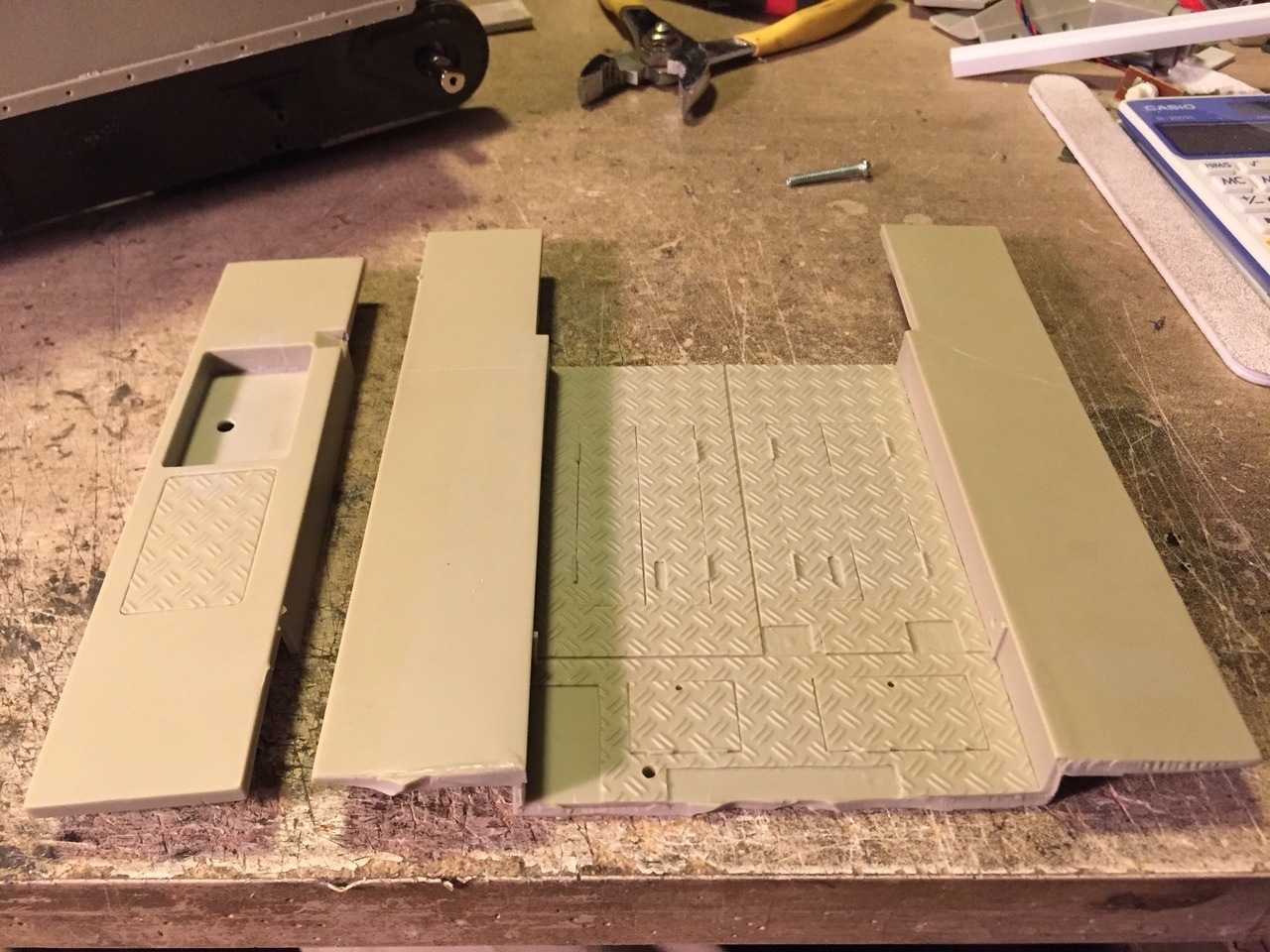 I decided not to use the Vandra kit part for the floor. For an accurate interior, it will be simpler to rebuild one from scratch. I do not like the use of double diamond treat plates either. The M7 Priest has single diamond plate pattern. So, the new floor will use JTT97449 1:100 single diamond treat plate that closely match the pattern.