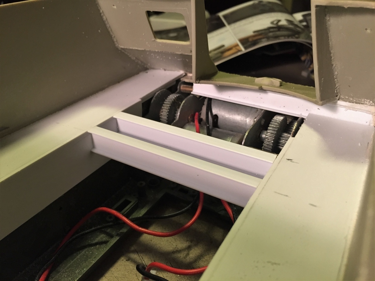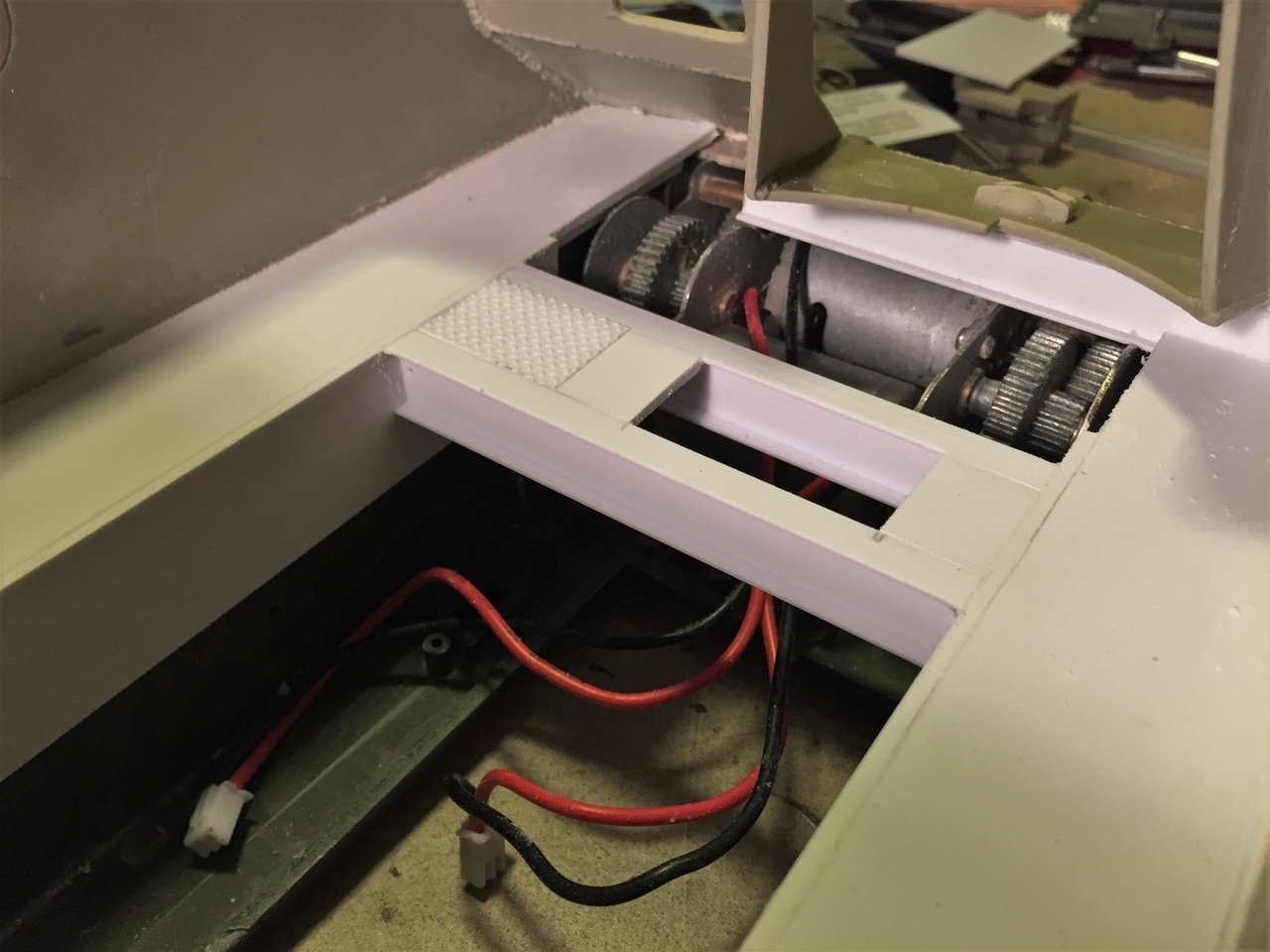 First, the immediate problem I had to resolve before going further was with the front hull itself. As you can see in the picture, there is a terrible weak point in the hull where the gun mantlet is located, with a lot of warping towards the inside that no amount of pulling, gluing or sanding could fix. The Priest hull has limited structure at that point and truly need reinforcement. The only choice I found was to throw an I-Beam under it, supported by the gearbox frame. It should not show too much once the gun is in place. The I-Beam is a Plastruct 11.1mm no 90519. As mentioned in a prior post, the hull is sealed and all access to the electronics will be done through the former bottom battery trap.