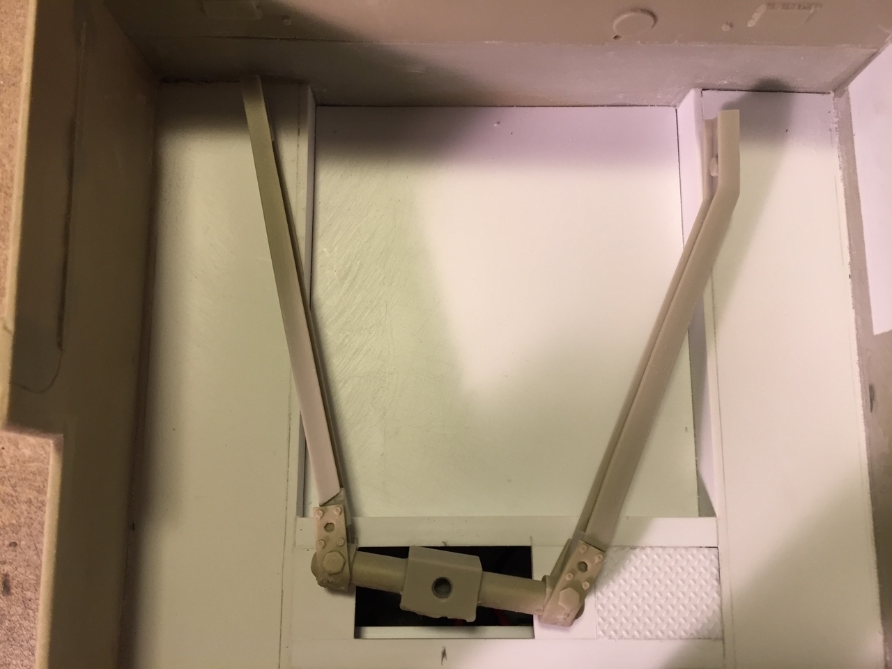 The floor has been installed. It is 10.5mm deep. The tread plates will be installed on top soon for a 10mm depth, the height of the trails. I still need to figure out if I will cover the gearbox with something. On the real M7, this is a open pit for the transmission and driver seat of the left, so I might leave it like that. I'll see.