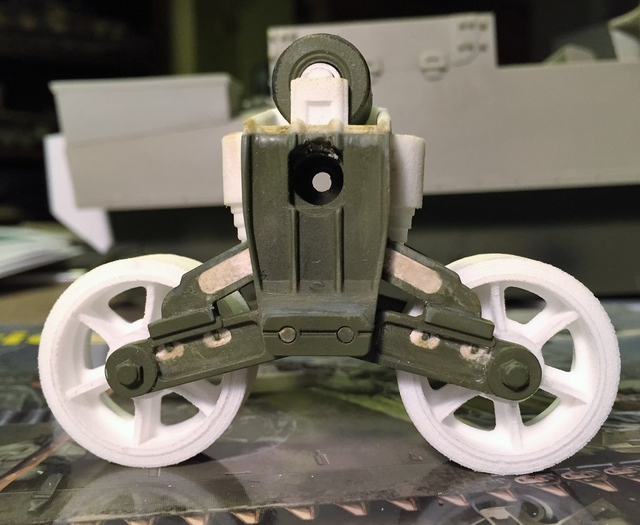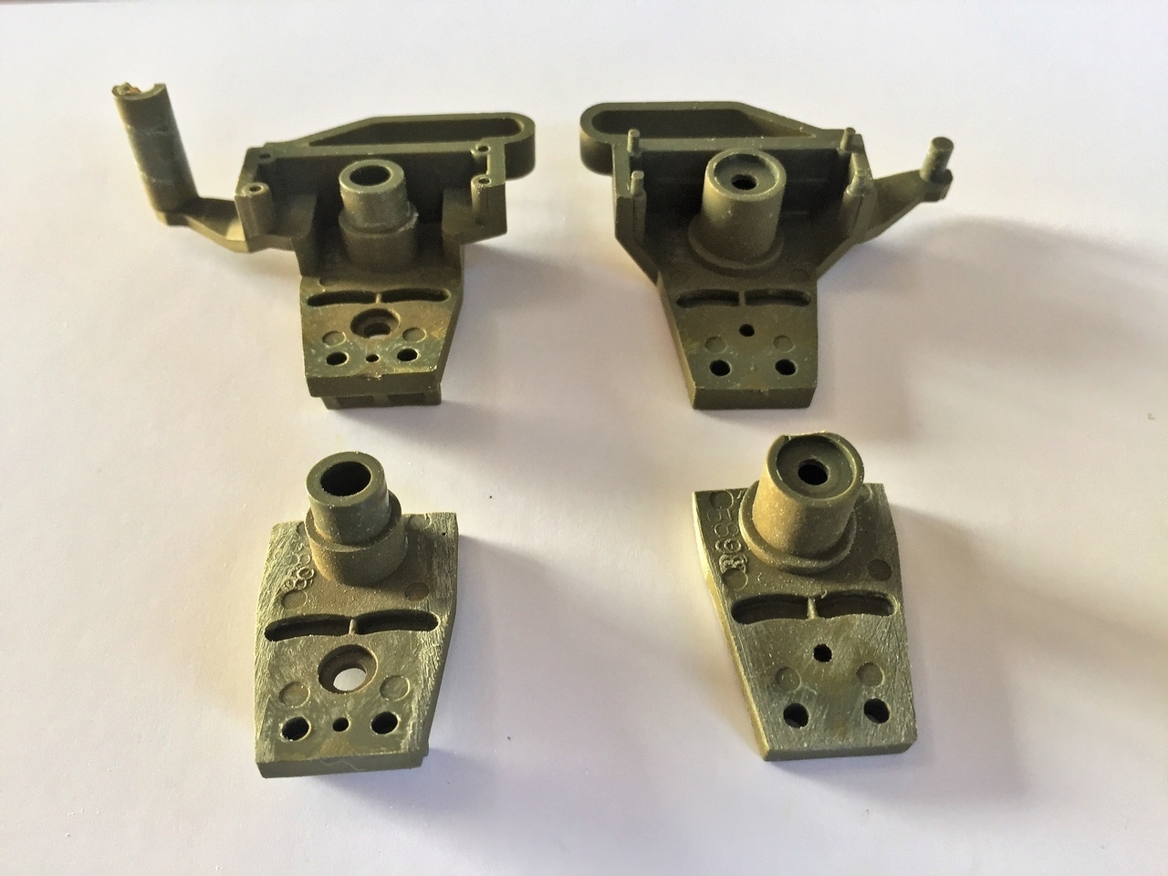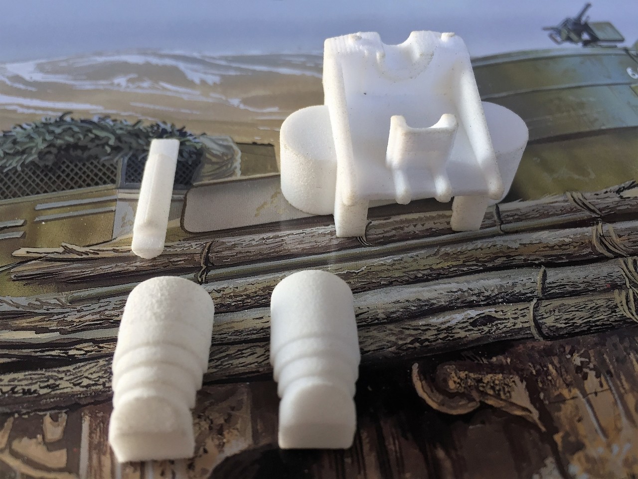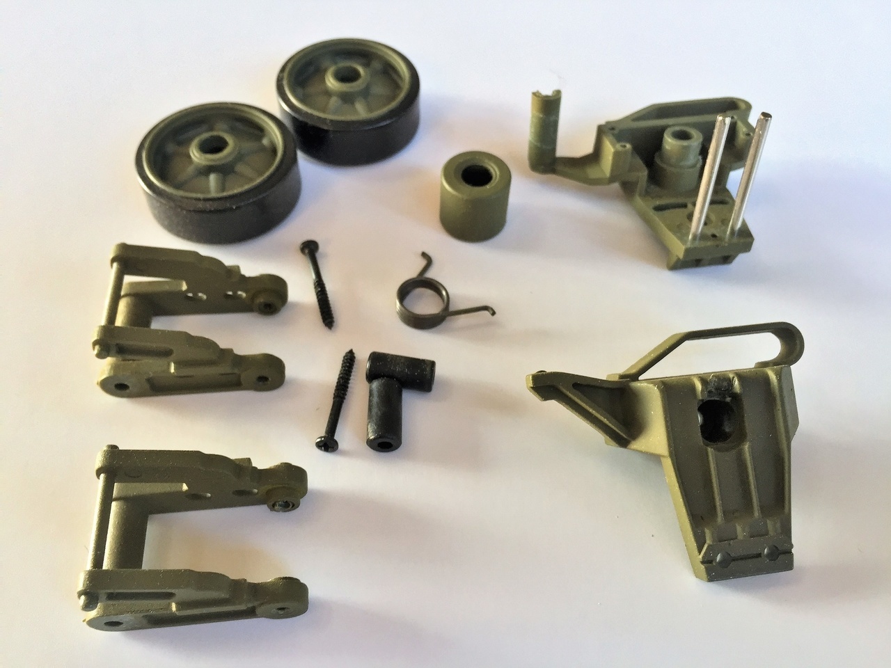 These are the Shapeways part for a single bogie. The material is harder than expected, the 3 plasters on my fingers can attest. Don't know what material is used but It is much stronger than the usual model kit plastic. But it can be cut, sanded and reacts well to superglue.