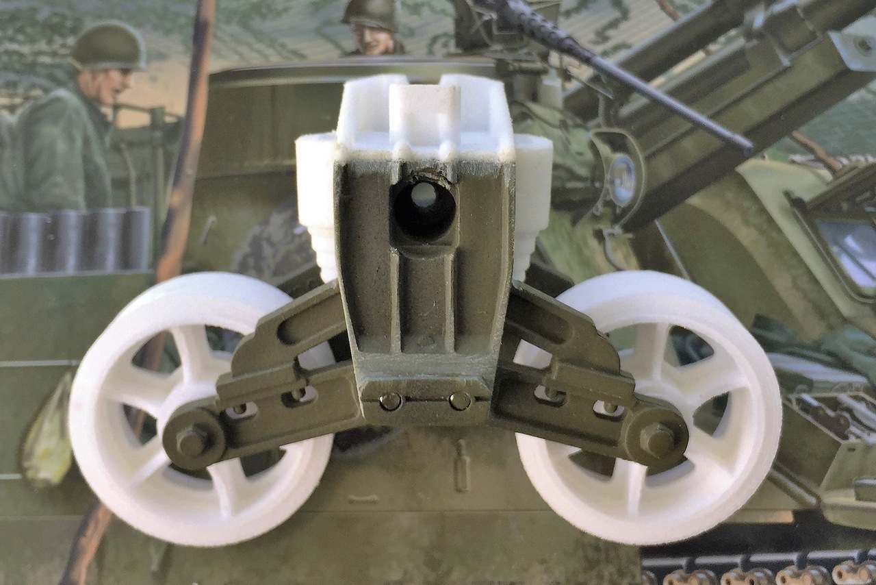 The HL roller is installed. A 6mm rod must be used as a spacer. I filled some Sherman style cavities that are not present on the M3 bogies I have seen.
