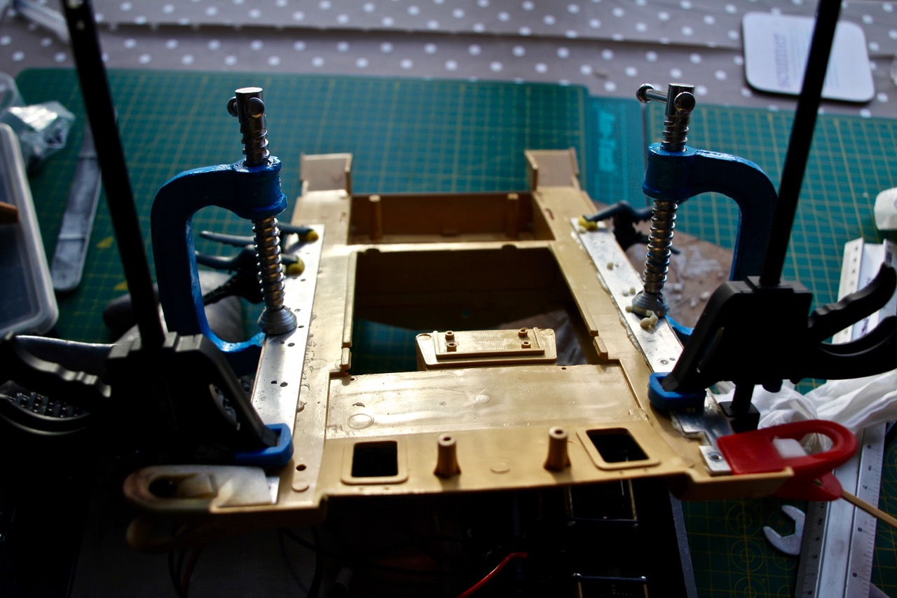 So the only thing for it is permanent orthopaedic traction. The means bonding some stiffeners (straighteners) in with epoxy, to keep the wayward front attached to the front panel.
