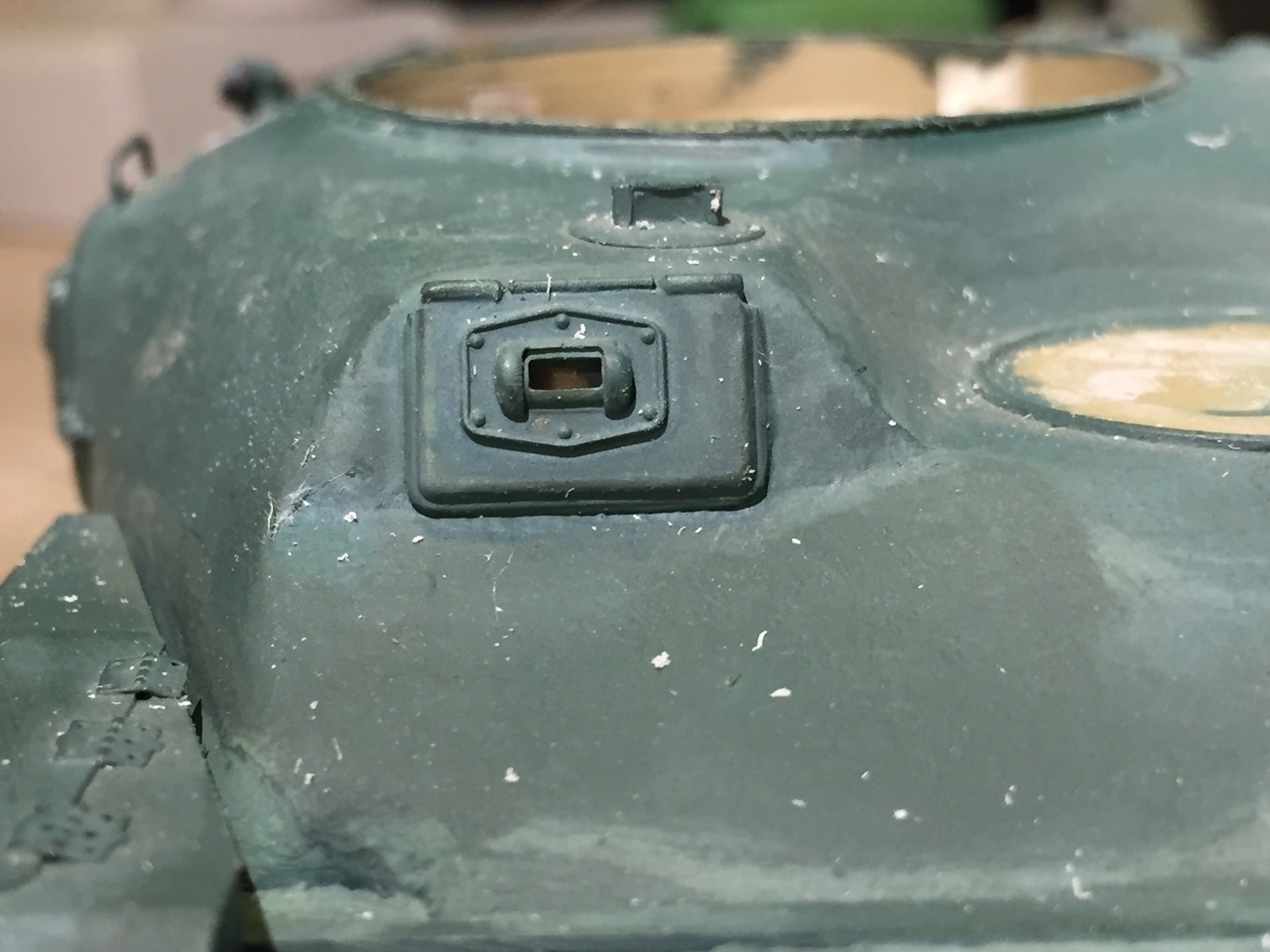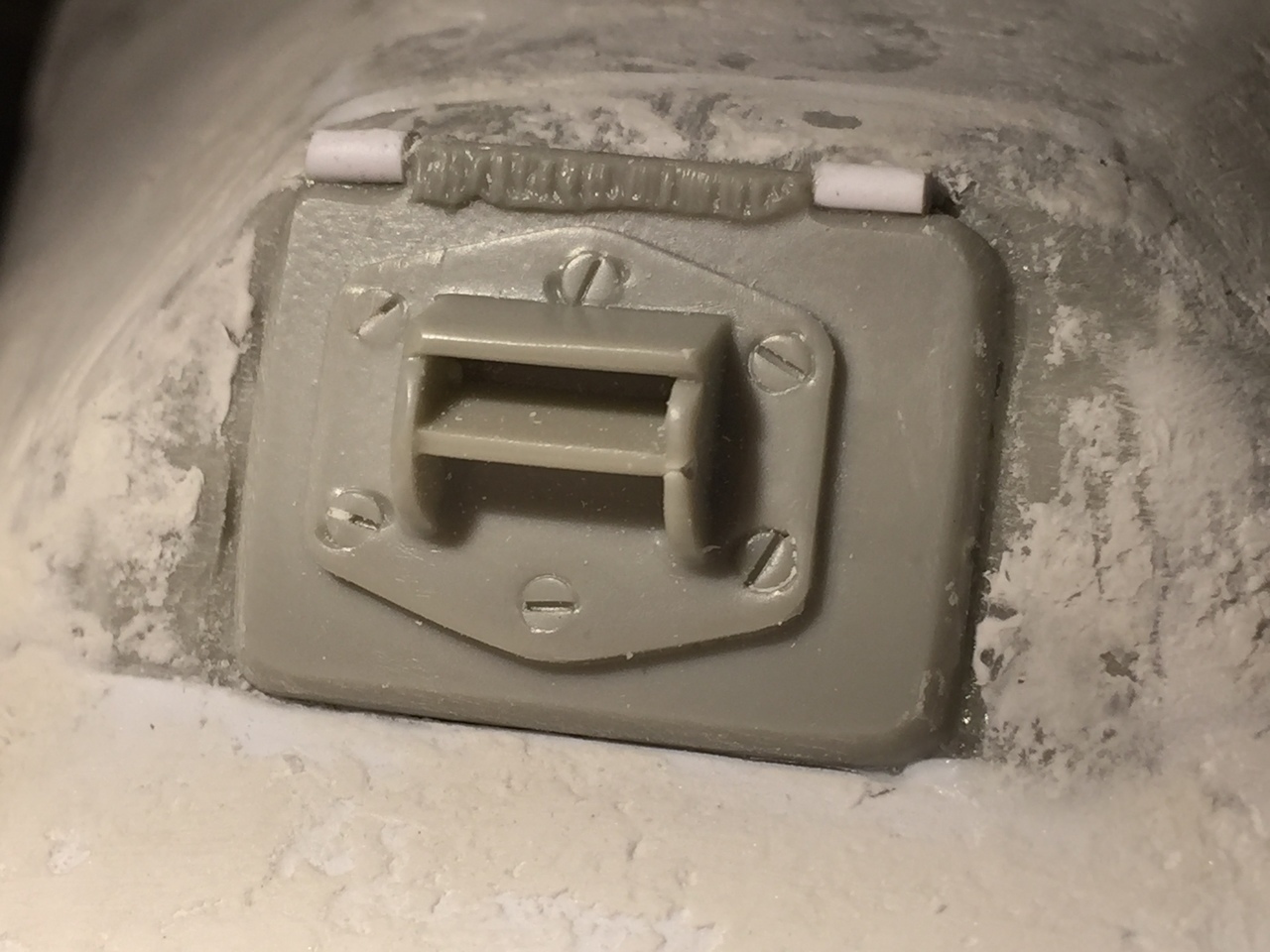 View from the rear of the hull cast effect and door hinges. The door was glued in place. I saw no real reason to make it open and close. Enough hull cutting...