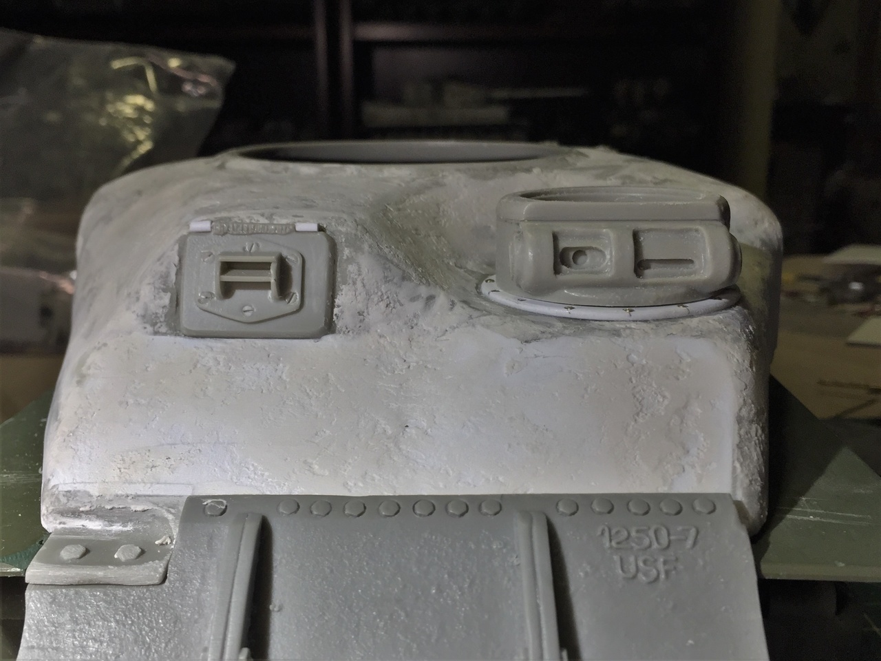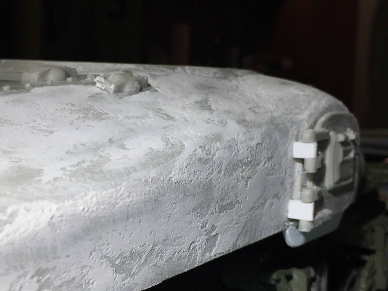 A layer of putty was applied to create the base for the cast effect and it will be sanded next, leaving uneven areas that replicate casting imperfections. The casting on the Ram is really rough according to the pictures I see so I will reproduce it on the model. There is still a lot to do on the hull. Be aware that Vandra had put the left door hinges on the wrong side and it needs to be redone for an accurate model.