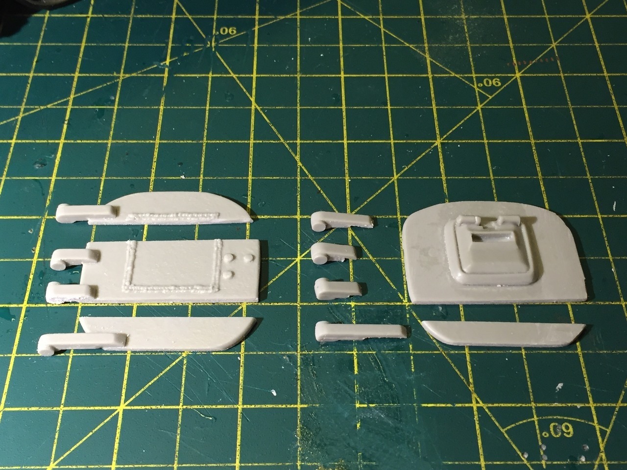 These are the side doors as provided. Like the machine gun turret, they were obviously made to fit the original taller hull and are therefore way too high and square, they should be rectangular. In any cases, they need to be modified to fit the corrected hull.