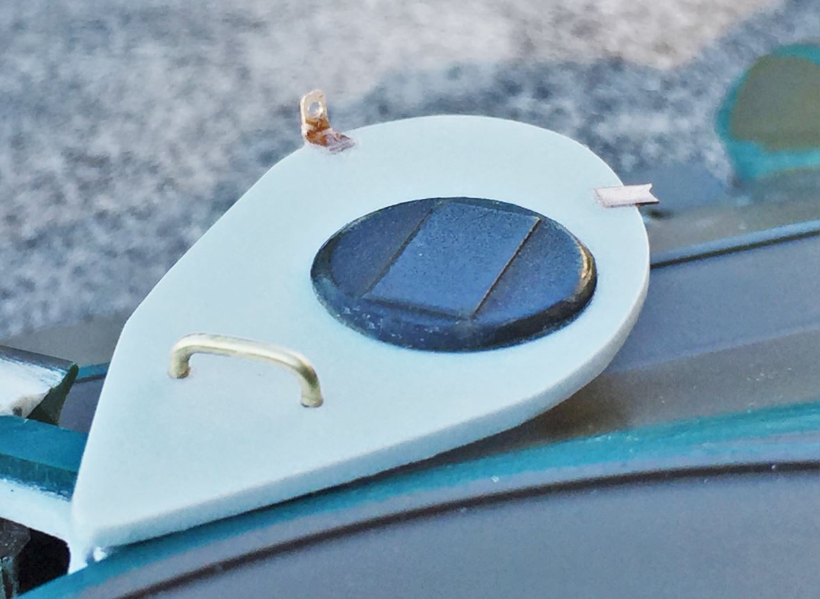 Right headlight and guards. The guards are made in 2mm wide and heavy brass strips, flat for the front and in L shape for the back support. The blackout light on the left is the Heng Long part that was modified, and the LED was reduced in depth with a nail file to be more realistic.
