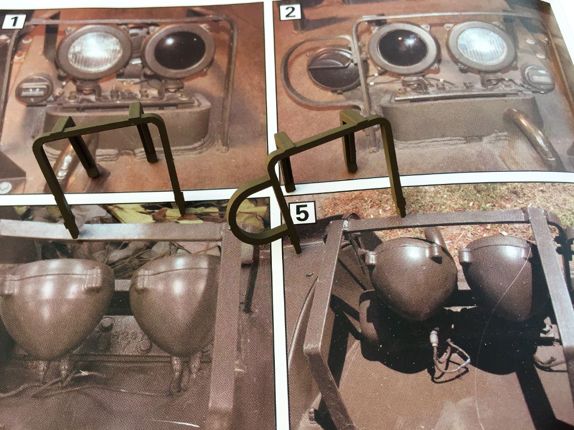The book "Walker Bulldog" by David Doyle has excellent pictures of the M41 headlights. This book really complements the Squadron walk around with different angles. Shown here are the Heng Long headlight guards that I found were lacking in finesse and I decided to replace and have fun at the same time.