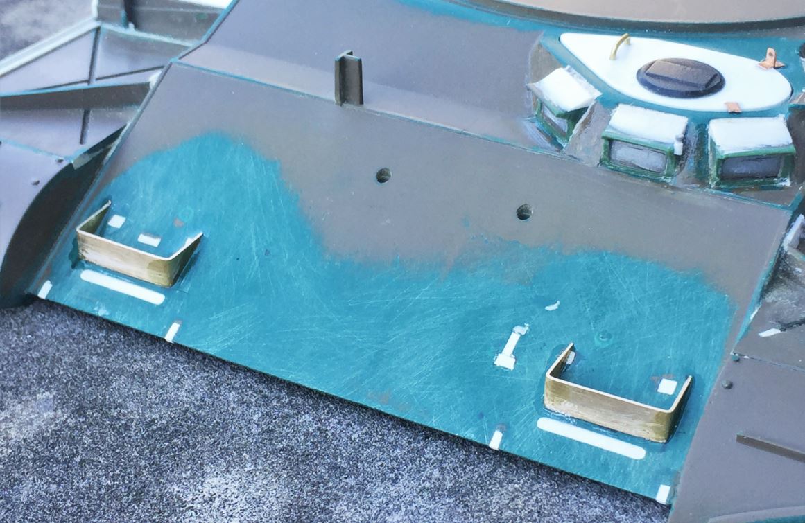 The glacis is sanded, removed of all embedded details, holes plugged in with residual plasticard and superglue, and polished. The base frame for the headlights is made from 6mm wide heavy brass strips.