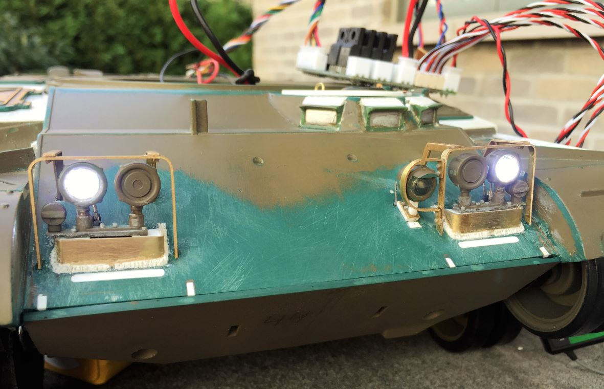 The Heng Long parts for the headlights were reused pretty much as is. I found them to be acceptable. After some more or less easy drilling, a 5mm LED was inserted inside the 2 headlights that use bright lights. The other 2 are IR night vision lights and the lenses should be painted black.