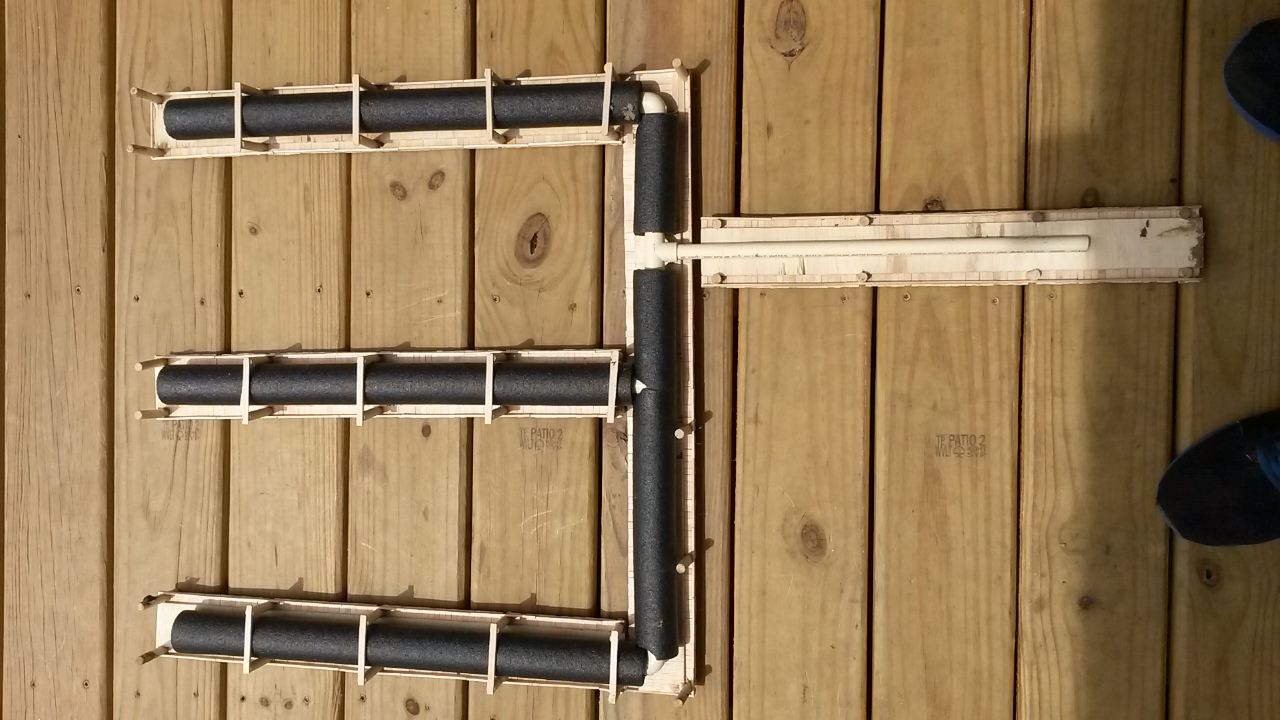 The inner frame is 1/2 PVC pipe covered with pipe insulating foam. The dock planks were glued down to a thin piece of plywood. I let a few planks off until I mounted them to the pipe pieces. #6 counter sunk screws fit great in the openings. After the decks were screwed down, I glued in the planks covering the screw heads.