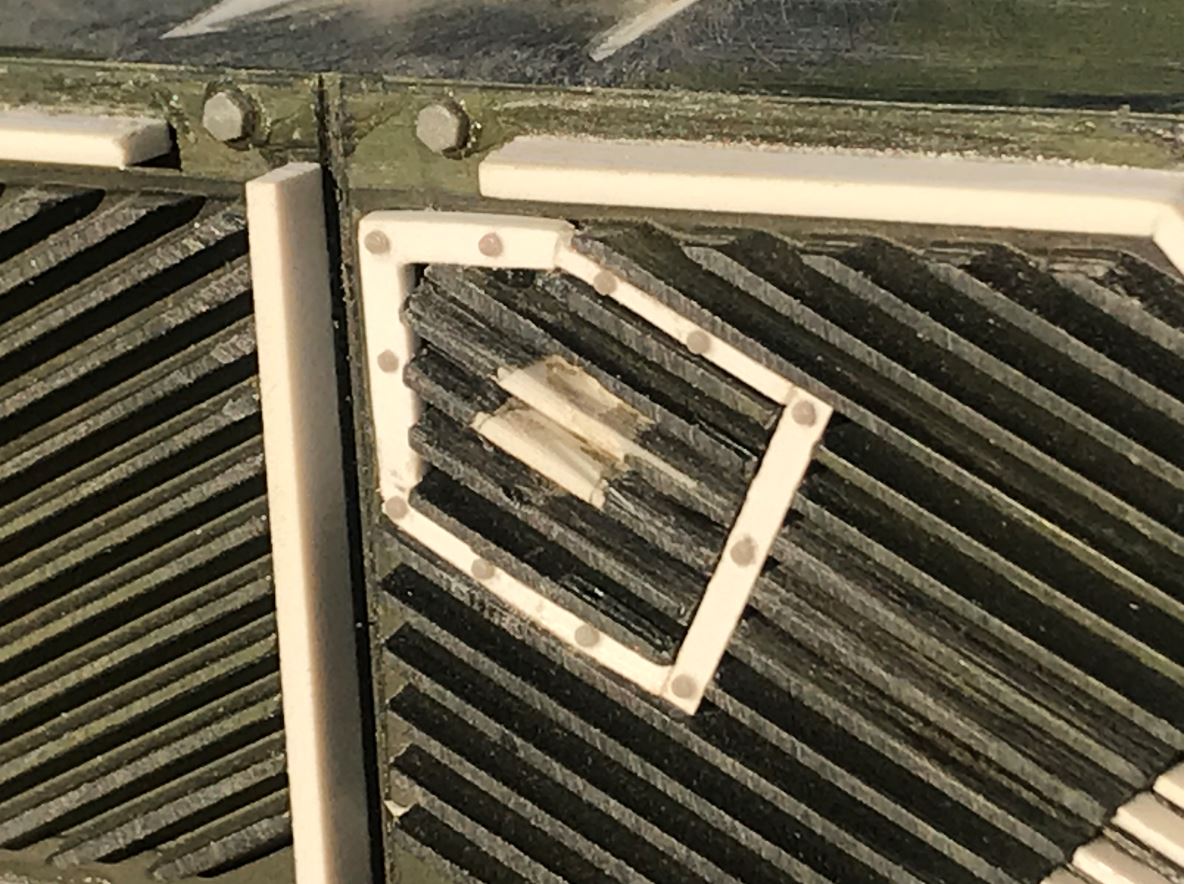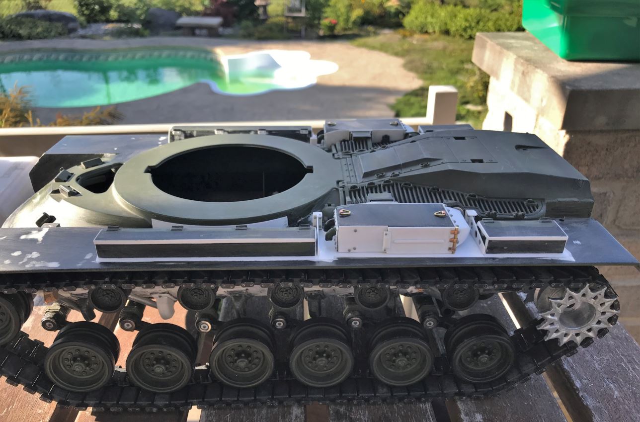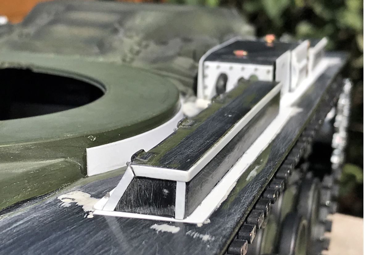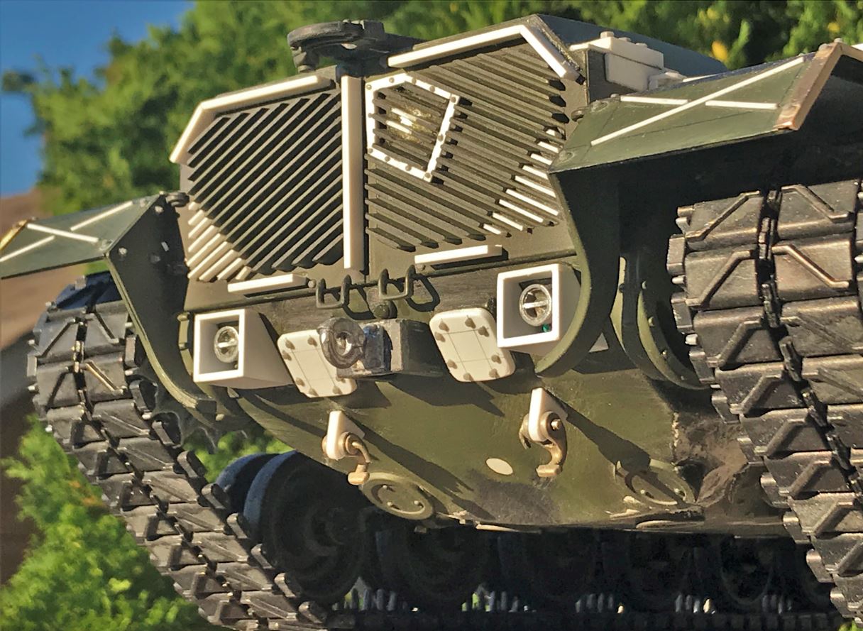 Here is the almost finished M48 rear. The armor strips on the grills and armored boxes around the tail light were added, and some additional details in white plasticard. AFV_Model M-26 shackles were used. One area I did not improve yet are the grill doors and hinges details on the sides. TBD later because there is some structural issue with the side of the grills that need some thinking. At this time, I prefer to move on to the turret.