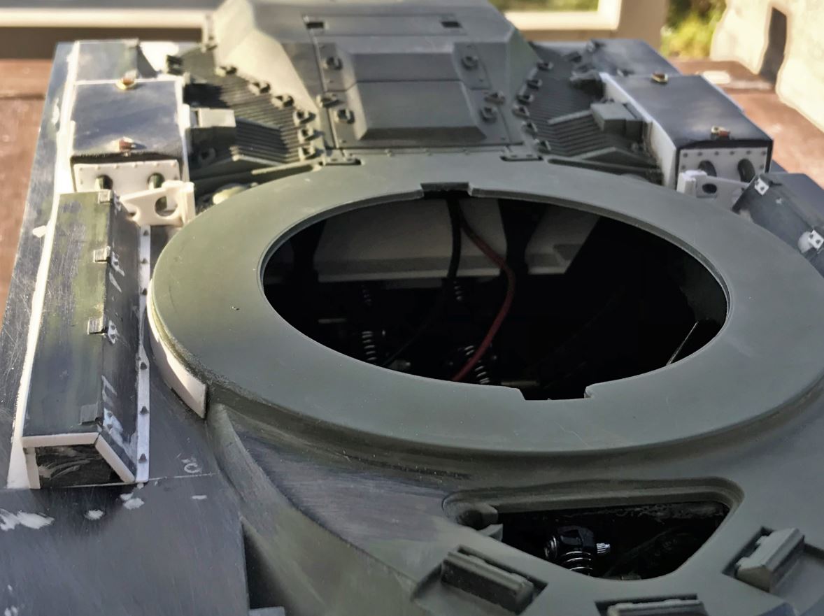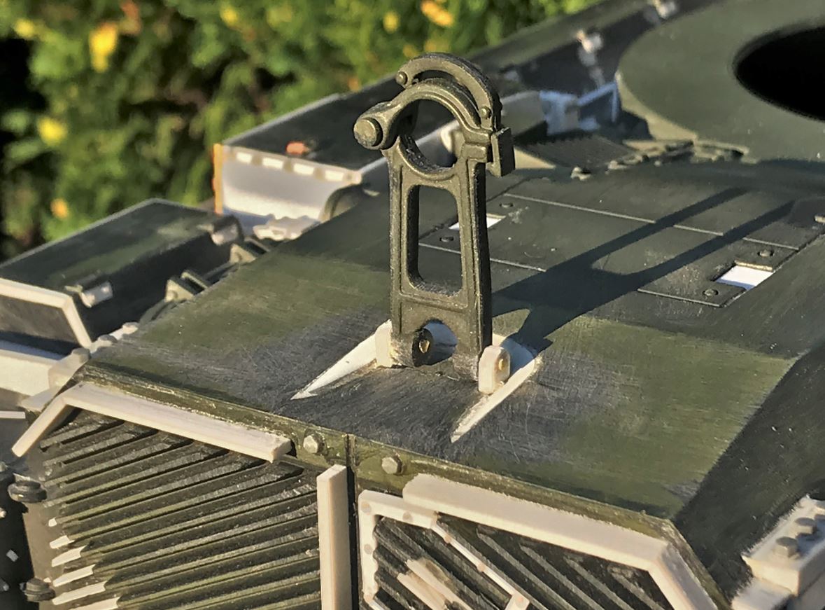 Once the snorkel attachment is removed, the hole need to be plugged and the base for the mount needs to be built with plasticard strips and Meng nuts, as seen in ref pictures.