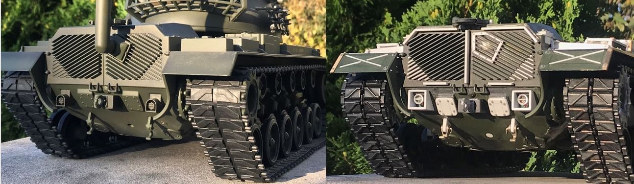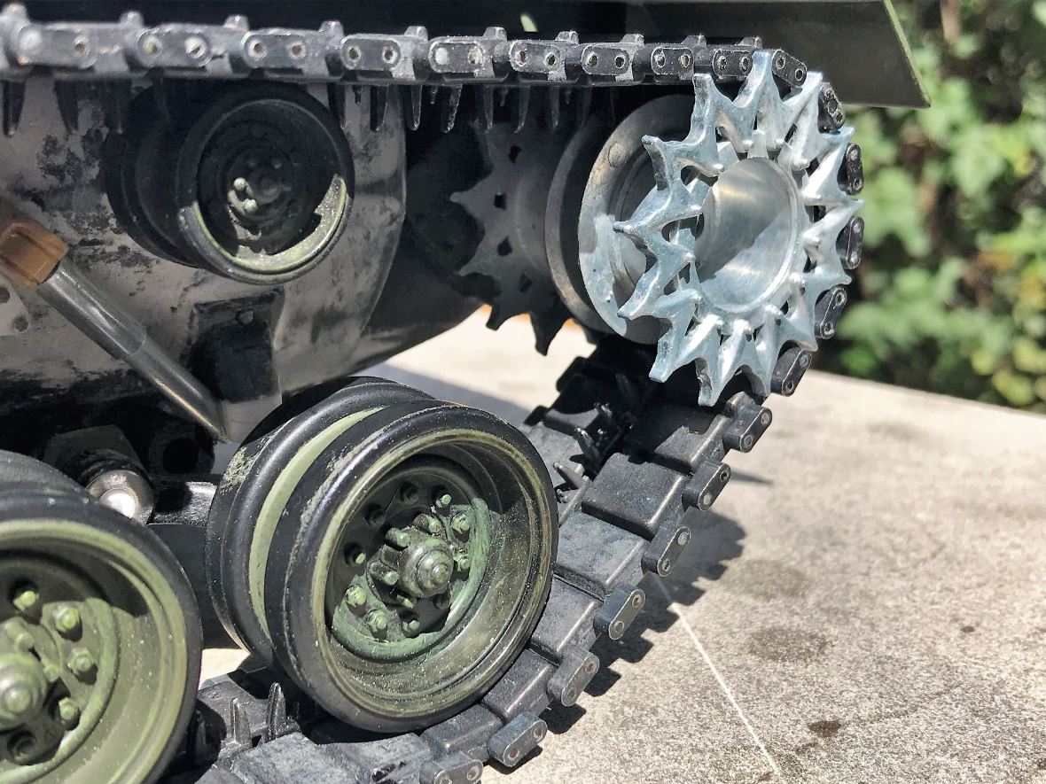 Also installed the newly received 1/16 Mato M-26 metal tracks and sprockets as replacement for the plastic ones i had in store. They are really superb tracks and they give the model tank the weight needed to properly activate the suspension instead of flying over obstacles. The tracks and sprockets are on sale at Mato Mart for $67 US, highly recommended. It would have been nice to have the right M-48 tracks with rubber chevrons but the M-26 are the closest tracks available.