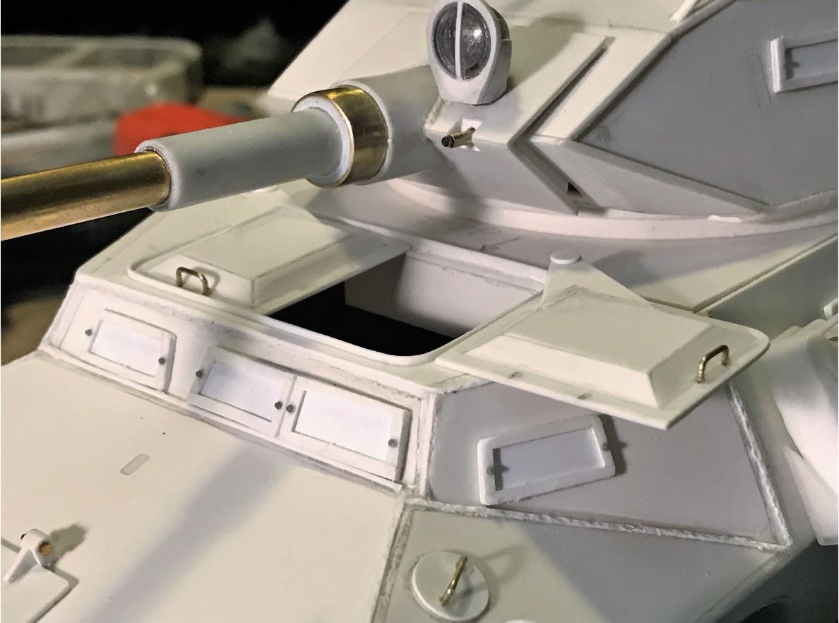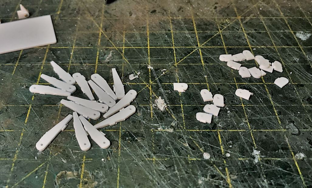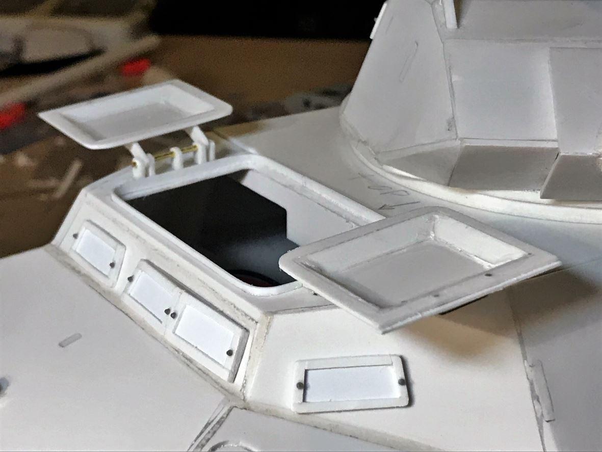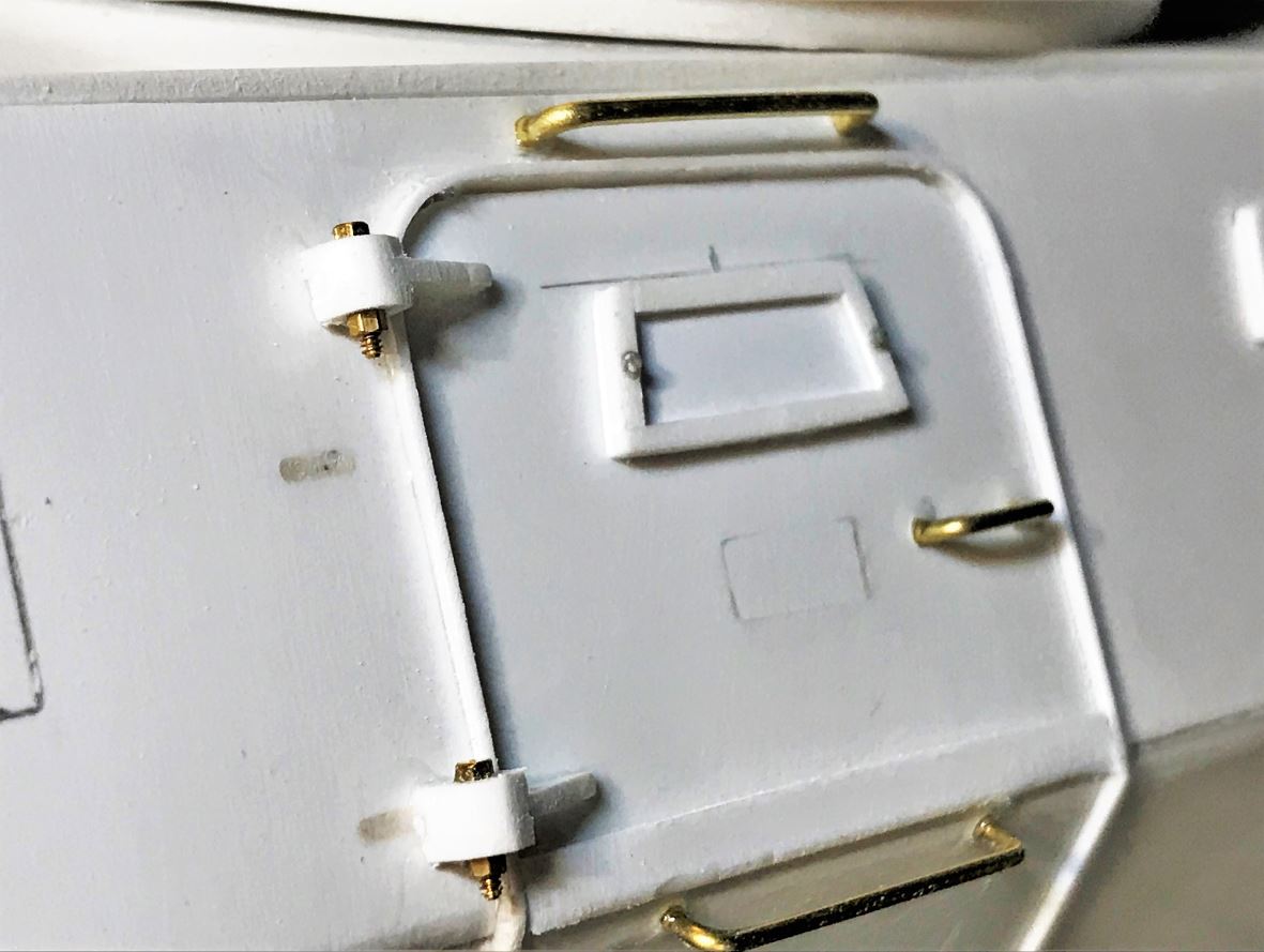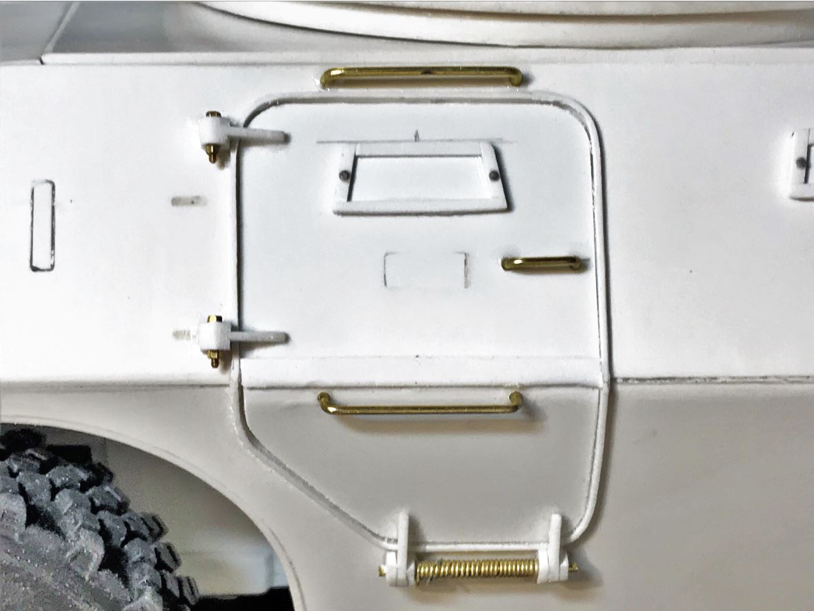 With a total of 15 hatches of different shapes and sizes all around the vehicle, completing the "hinge" job on this model requires patience and an assembly chain. Ludwig provides some basic hinge shapes but they need to be downsized by about half, and there are too few of them, so many hinges need to be completely created from residual plasticard sheet. M1 x 5mm bolts and nuts are also required for most.