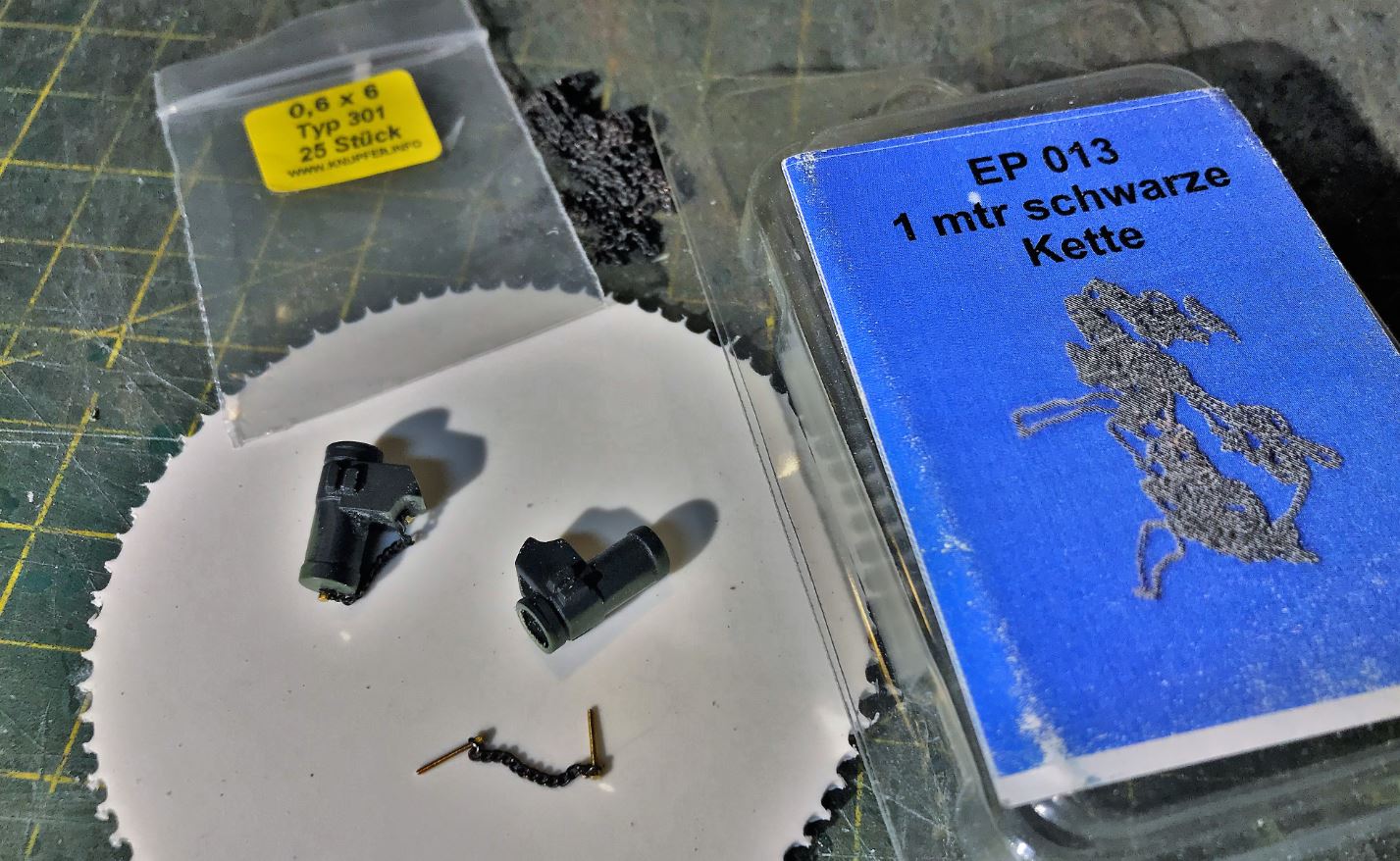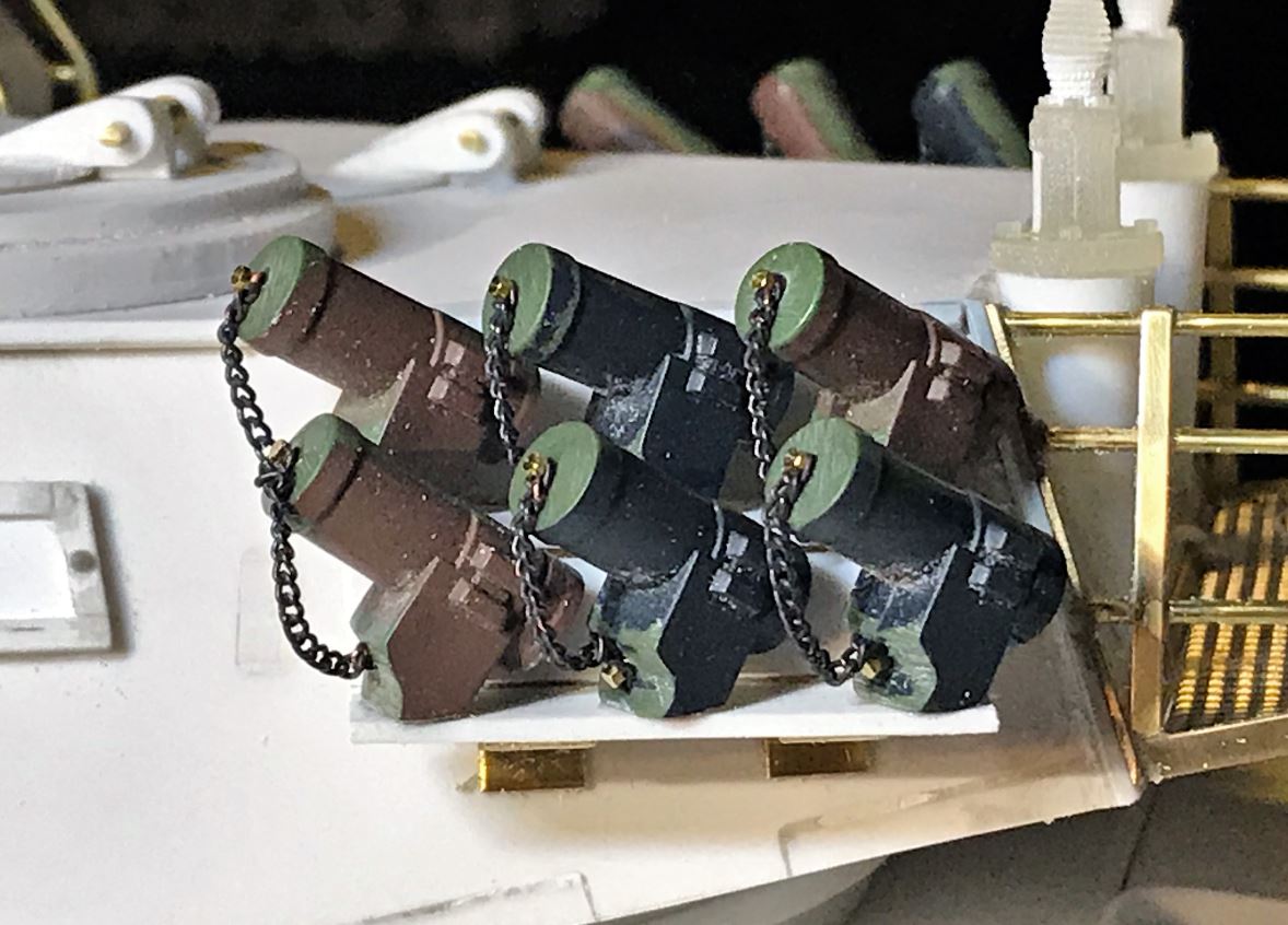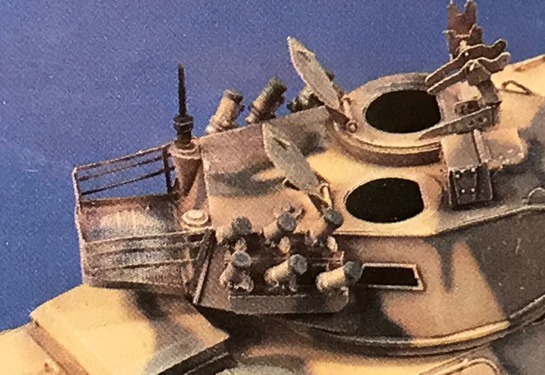 I chose to use Heng Long Leopard II smoke grenade dischargers purchased at Mato Mart. Calculations extrapolated from the Hobby Boss 1/35 kit show these to be about the right size. M0.6 bolts and a small chain add details for the cap.