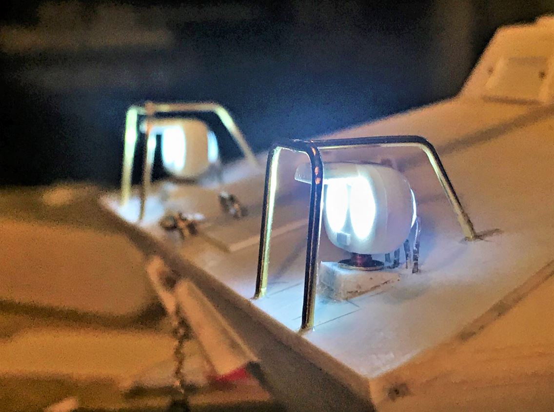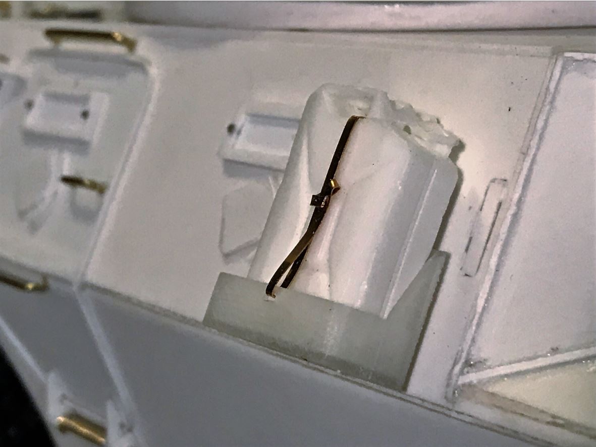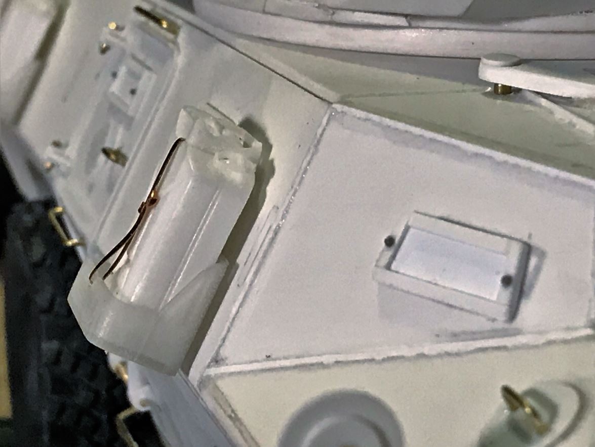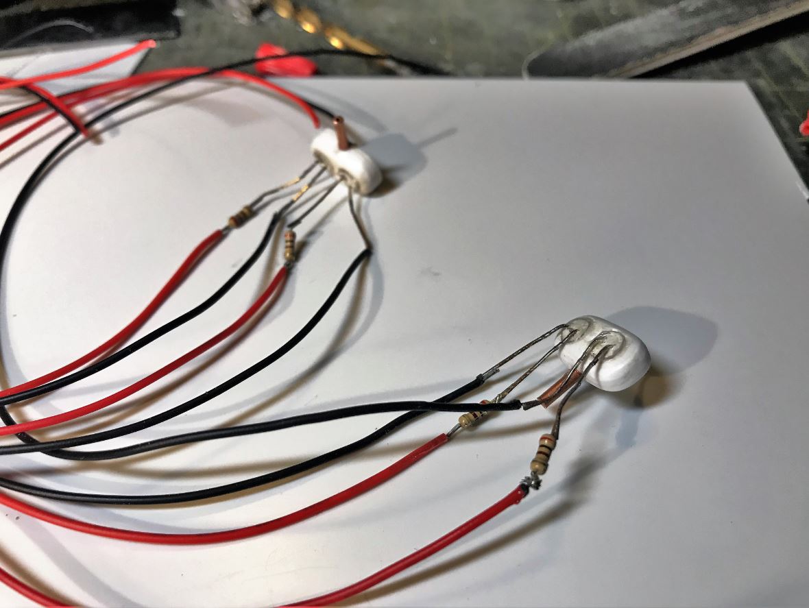 These are installed on a brass bracket with a 3mm red LED with resistor. Clear red lenses will be installed after painting.