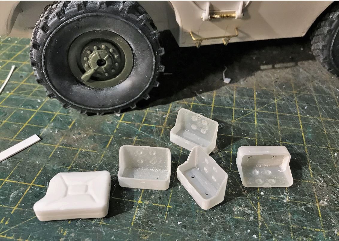 These are Shapeways US Jerrrycan holders. I went lazy scratch building these so i purchased 4 of them, not cheap. SOL model Jerrycans are used.