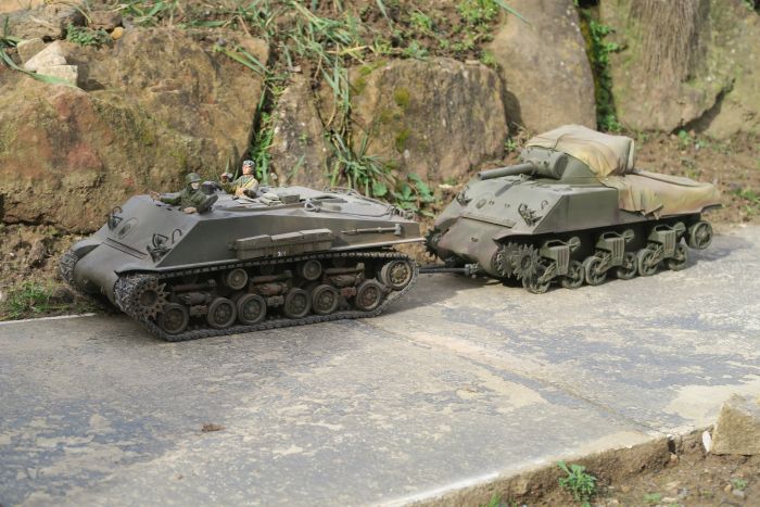 Great video, excellent vehicles. I saw that last Sherman had a little trouble with slippage and I've been having the same problem in my trailer. Was that one all plastic? I think the all plastic tanks don't have enough weight to keep them from slipping like that. I was thinking of gluing some 500 grit sandpaper to the ramp to see if that will give it better traction.