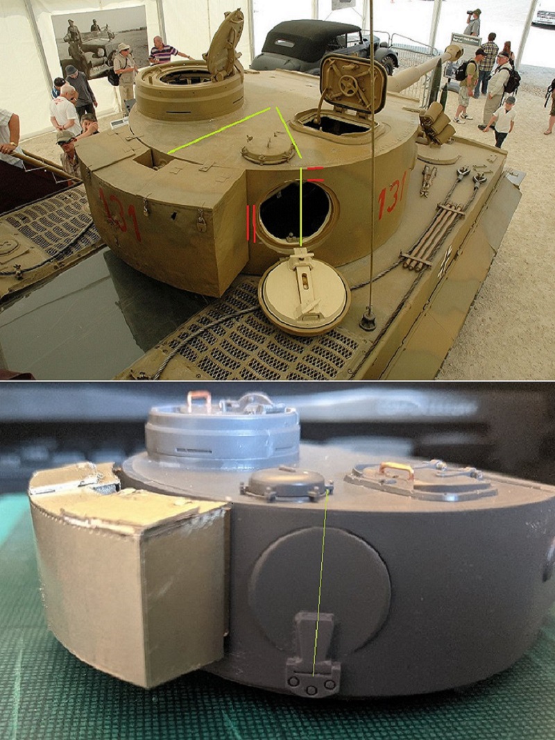 Hi Mr jimbo, I think you have the turret bin correct when central. I have spent the last few weeks tirelessly searching for good detailed close up views of Wegmann production rivetted turret bins with escape hatches in the same shot. What I have found in the few shots that exist, demonstrate that manufactures of all scale models of Tiger 1's do not seem to agree the correct angle/size of bin or position relative regarding the escape hatch. Tiger 131 is the only solid source we have as true reference. IMHO the angle of 45degree is correct, an imaginary line to the centre of the roof just kisses the lip of the turret vent. As you can see in the picture below the relative gap from edge of escape hatch to turret bin on 131 is smaller than your gap but appears to be central the rear lifting lug. IMHO you can only work with what you have, and what you have looks good.